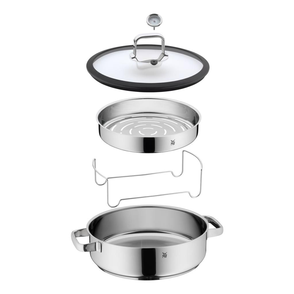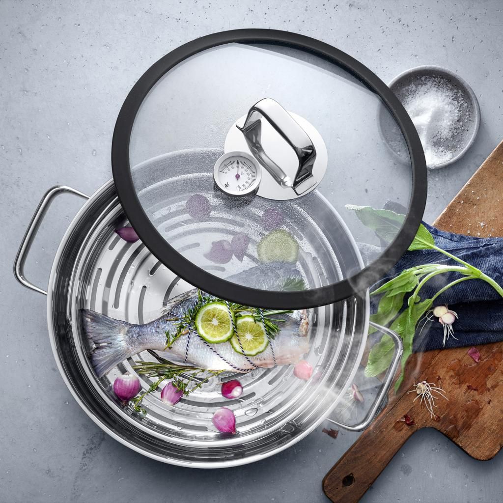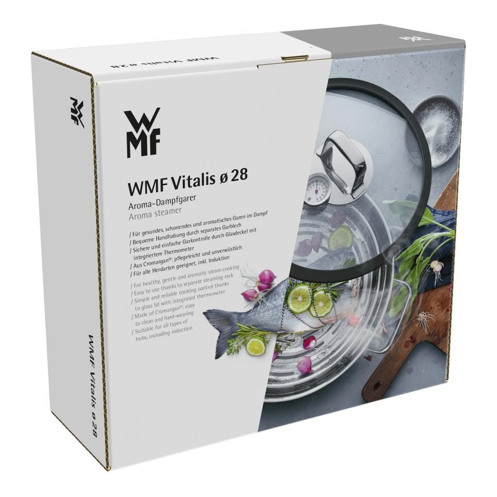 "Vitalis" WMF "Aroma" garų puodas, kurio skersmuo 28 cm, o tūris 5 litrai, pagamintas iš poliruoto "Cromargan®" nerūdijančio plieno, kartu su "Aroma" garų puodo įdėklu ir stikliniu dangčiu su silikoniniu sandarikliu ir integruotu termometru sudaro puikų garų puodo komplektą.
