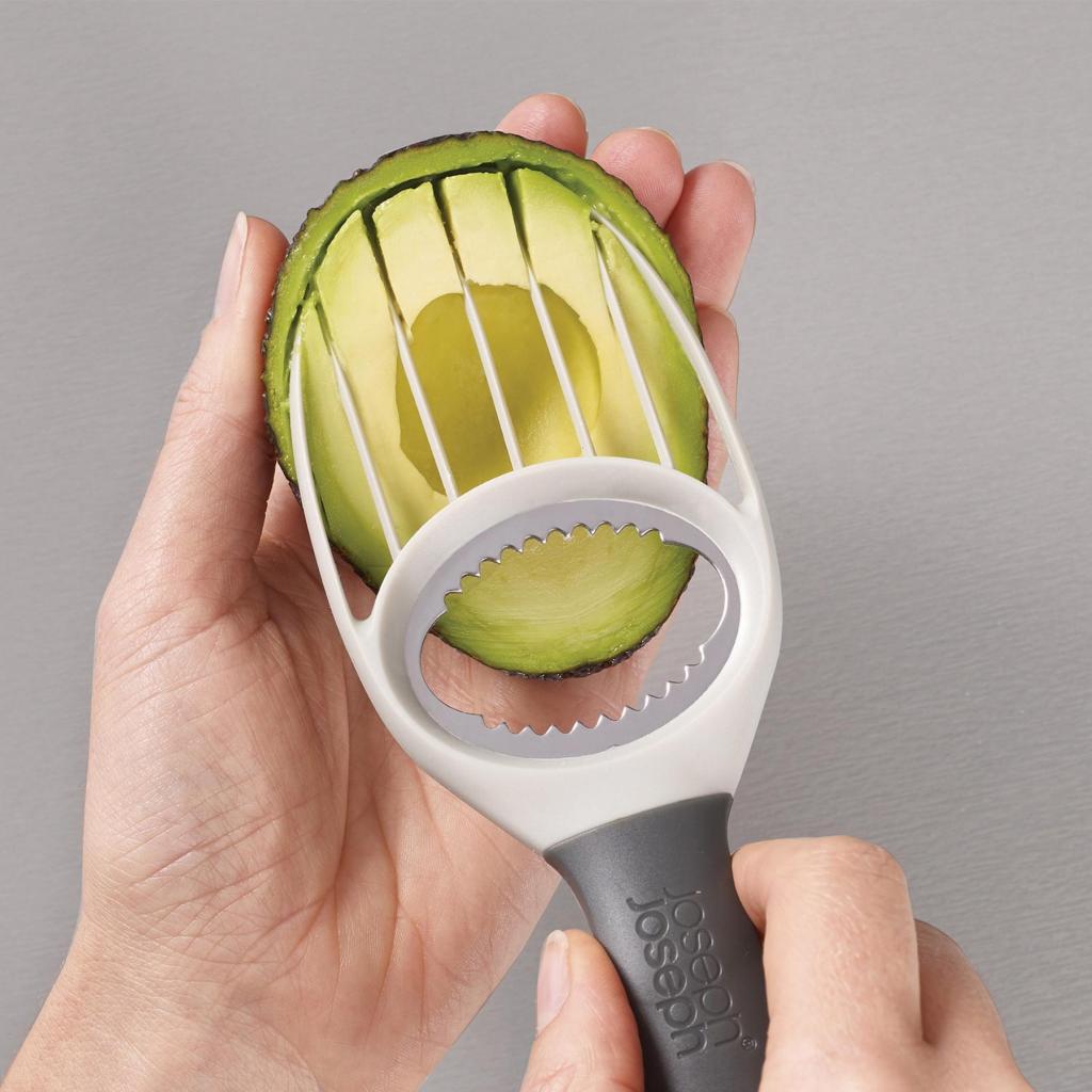 Yra dviejų tipų žmonės. Yra dviejų tipų žmonės. Tie, kuriems avokadą pavyksta gražiai supjaustyti griežinėliais, ir tie, kurie greičiau nei planuota baigiasi su guacamole. Su šiuo įrankiu pagaliau persikelsite į pirmąją grupę. Nulupa, išima kauliuką ir supjausto – ir be poreikio ieškoti Google „kaip saugiai išimti avokado kauliuką“.