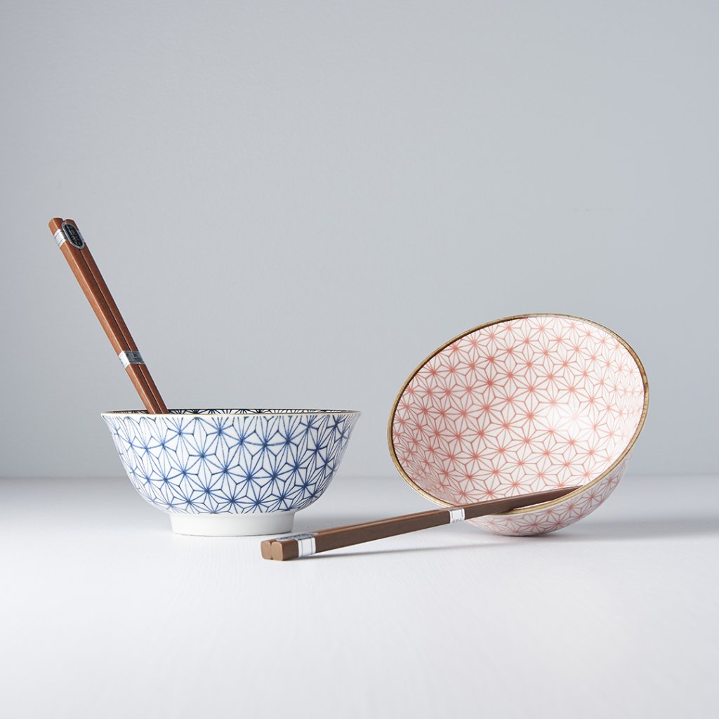 Rinkinį sudaro 2 mėlynos ir raudonos spalvos dubenėliai ir 2 medinės lazdelės. Kiekvienas dubuo turi tą patį geometrinį motyvą ir aukso spalvos apvadą. Šis rinkinys pateikiamas elegantiškoje juodoje dovanų dėžutėje, todėl tinka dovanoti draugams ar verslo partneriams.