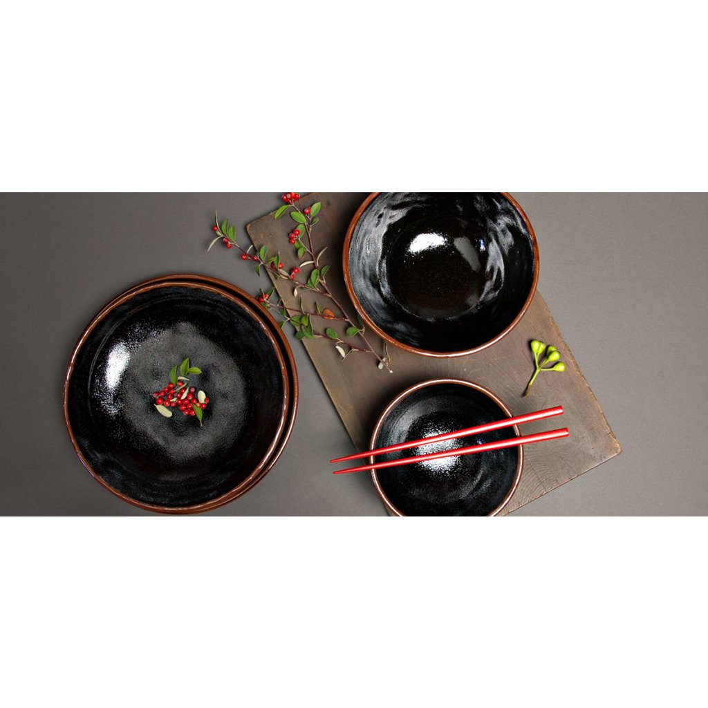 " Tenmokku " kolekcijos paviršius yra smulkiai grūdėtas, juodos spalvos, apvestas rudai raudona linija. Indai gaminami rankomis iš natūralios keramikos - juose nėra metalų ar kenksmingų dažiklių. Keramika yra geros kokybės, spalvos yra nuolatinės, nekintančios ir nesilupa. Kiekvienas kūrinys yra originalus, o jo tradicijos siekia XII amžių. Unikalus keramika importuojamas tiesiai iš Japonijos. jau 25 metus MIJ indai naudojami restoranuose, o jų kokybė ir ilgaamžiškumas jau seniai įrodyti. Indus galima plauti indaplovėje ir mikrobangų krosnelėje. |