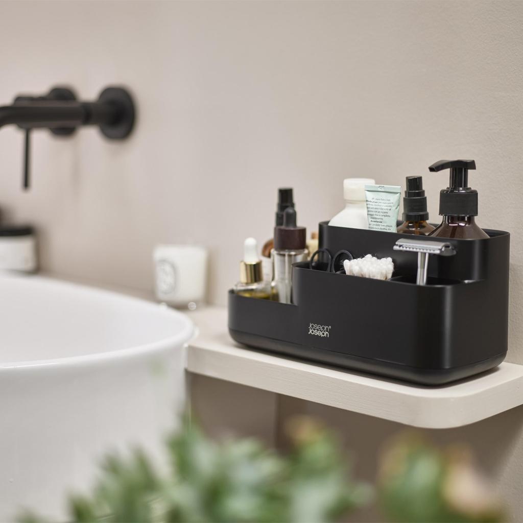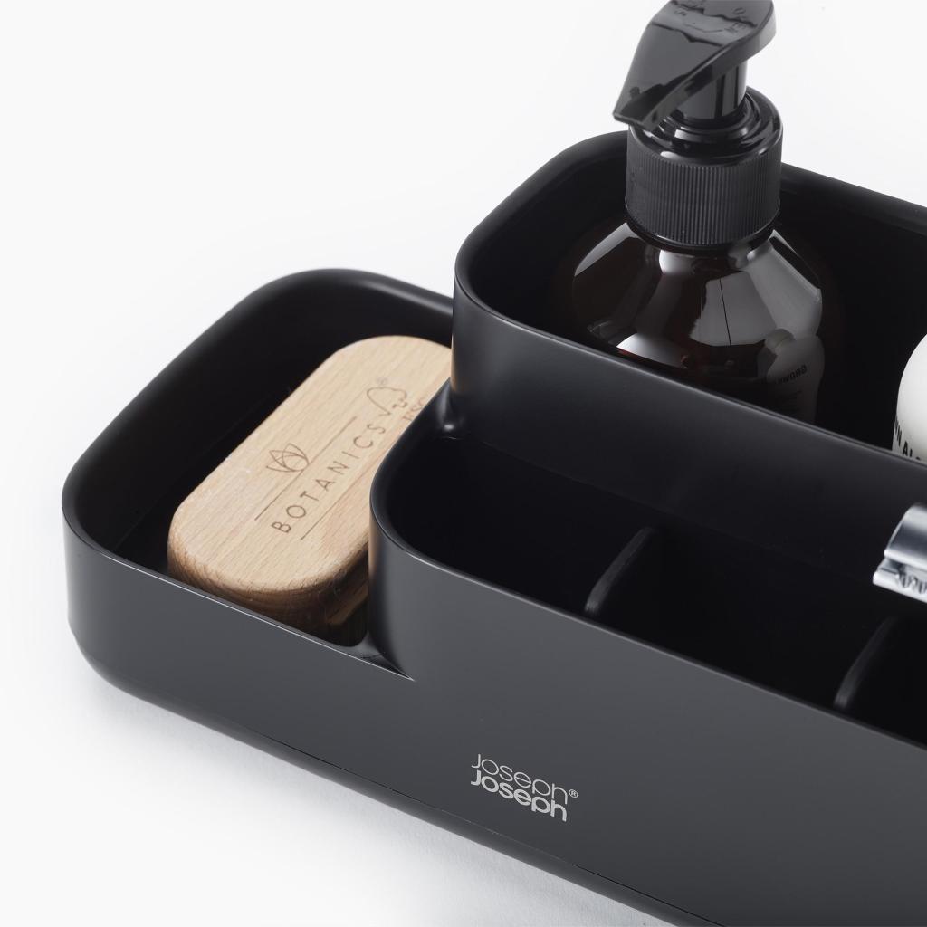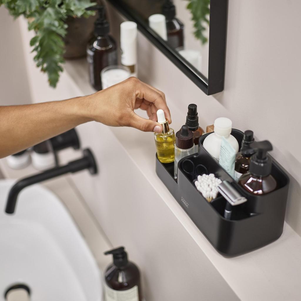 - Juodas vonios kambario organizatorius EASYSTORE suteikia tvarkingą ir stilingą sprendimą visiems kasdienės kūno priežiūros reikmenims sutvarkyti.