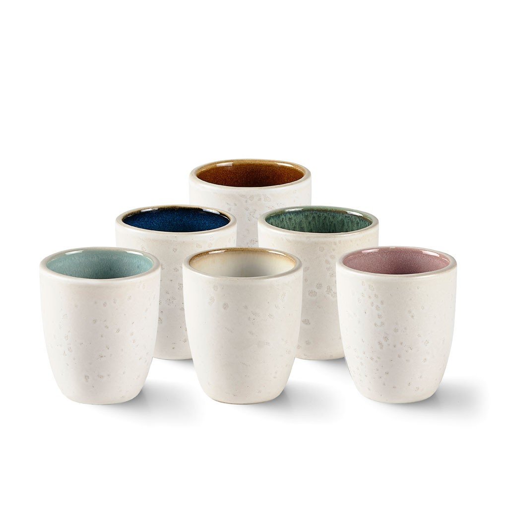 Bitz 6 puodelių be rankenėlių rinkinys, kurio talpa 100 ml , ypač tinka espreso kavai patiekti. Puodeliai pagaminti iš akmens masės. Jos vidus padengtas įvairių spalvų blizgia spalvota glazūra, o išorė - matine reaktyvine glazūra. Jis kuriamas rankomis, todėl kiekvienas kūrinys yra originalus. Mėgautis maistu ir sąmoningai jį suvokti - toks yra Danijos akmens masės indų gamintojo Bitz tikslas.