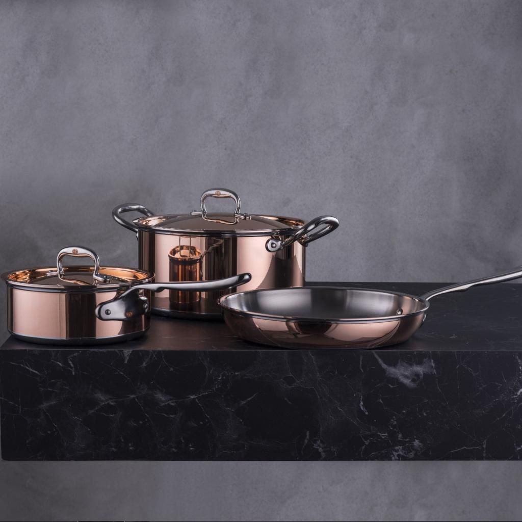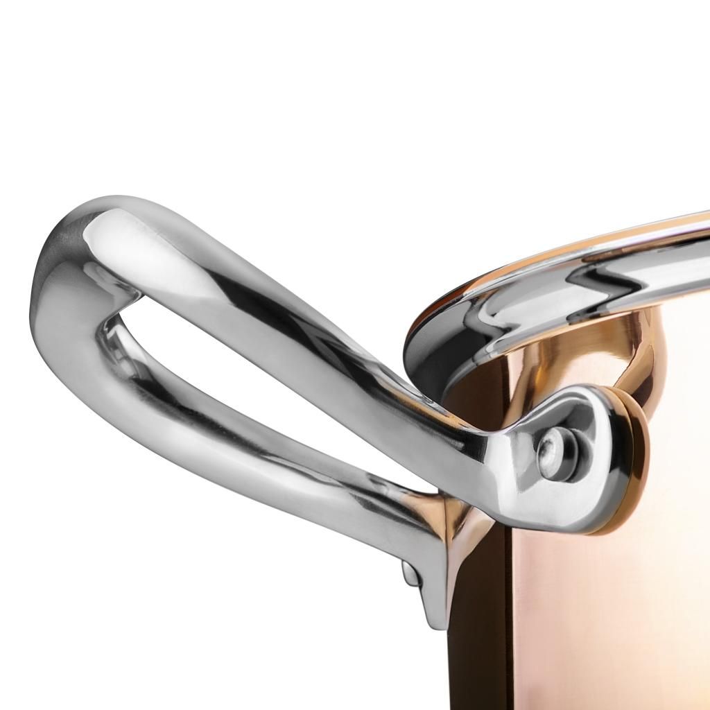 - nerūdijančio plieno rankena ir dangčio rankena su variniu įdėklu kepant išlieka vėsūs