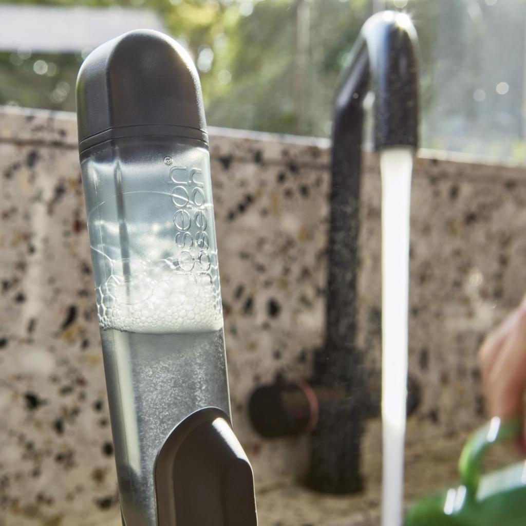 - Integruotas indų ploviklio bakelis leidžia ploviklį turėti tiesiai rankenoje, todėl plovimas vyksta sklandžiai, be nuolatinio griebimo už buteliuko.