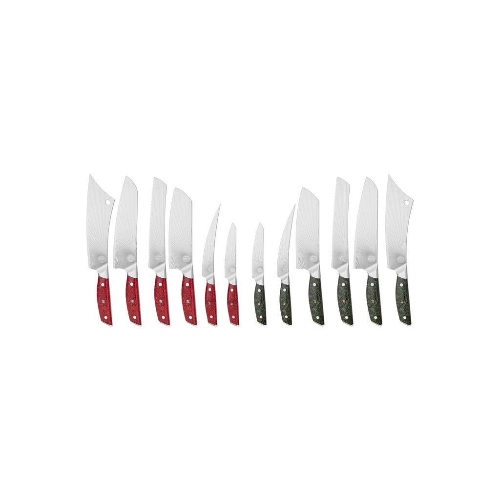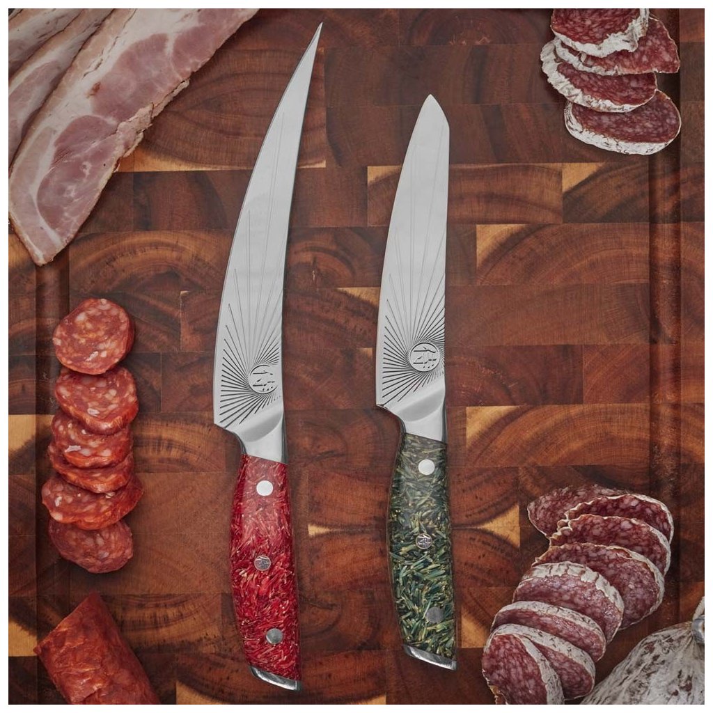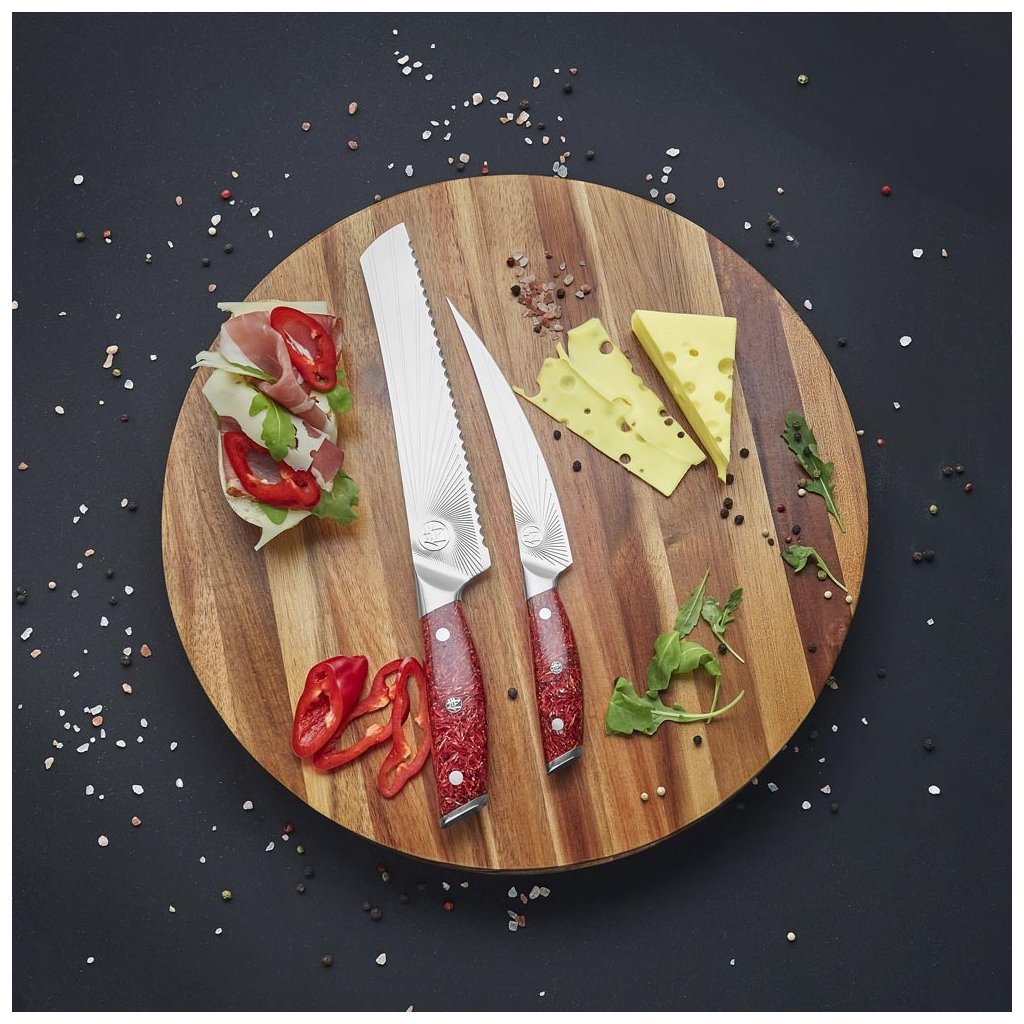 - "Sunburst" raštas ant ašmenų sumažina trintį pjaustant ir neleidžia maistui prilipti prie ašmenų