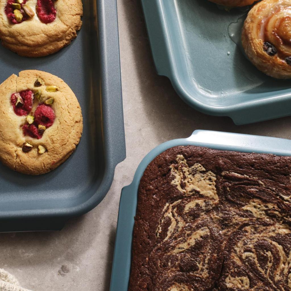 - NEST BAKE trijų kepimo skardų rinkinys mėlynos spalvos yra praktiškas sprendimas kasdieniam kepimui ir didesnių šeimos porcijų ruošimui.