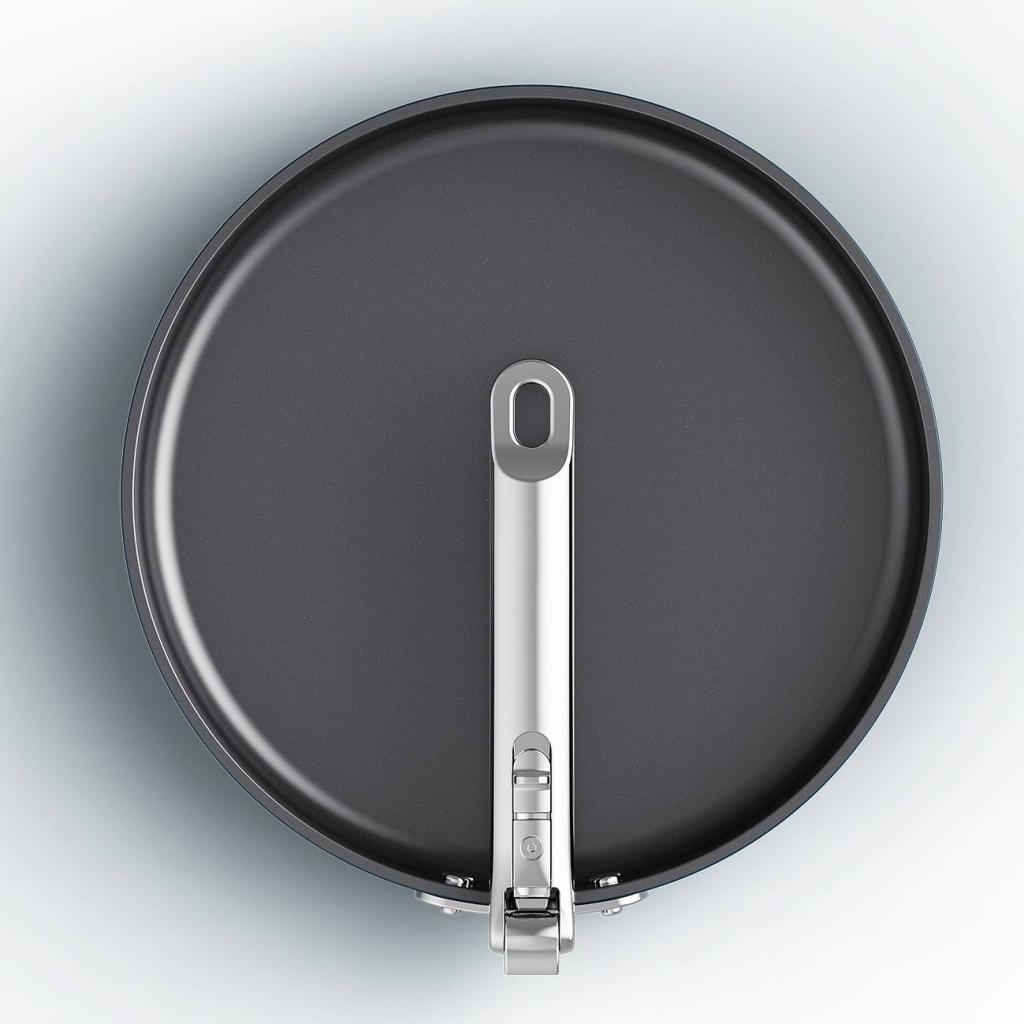- Sunkus aliuminio korpusas užtikrina tolygų šilumos pasiskirstymą visame keptuvės paviršiuje ir prisideda prie puikių virimo rezultatų.