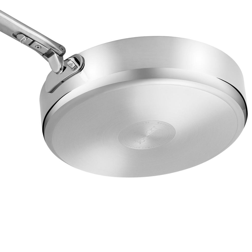 - Tvirtas trijų sluoksnių nerūdijančio plieno konstrukcija su aliuminio šerdimi skatina greitą įkaitimą ir tolygų šilumos pasiskirstymą visame dugno paviršiuje.