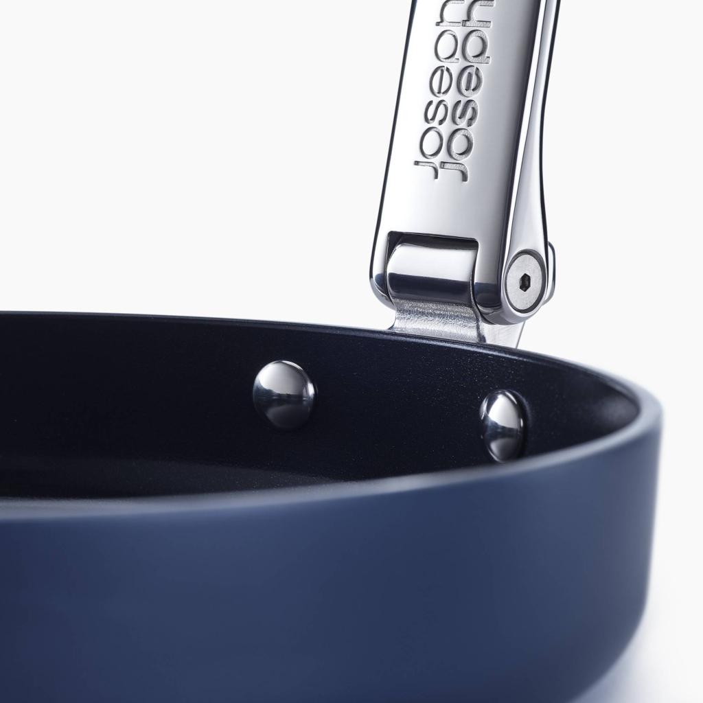 - Novatoriška konstrukcija leidžia sulankstyti rankenas, taip sutaupant iki 50 % vietos, palyginti su įprastomis keptuvėmis, laikant jas stalčiuose ar spintelėse.