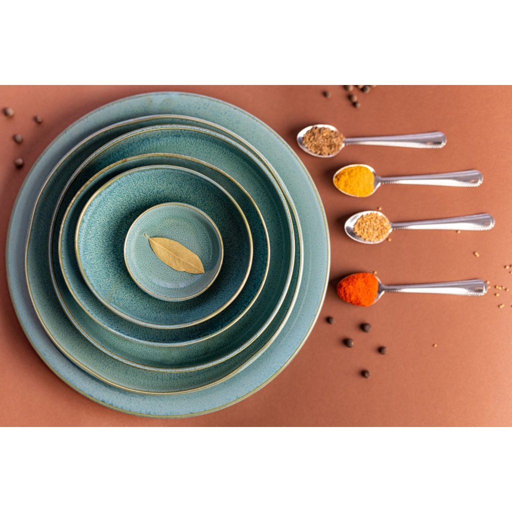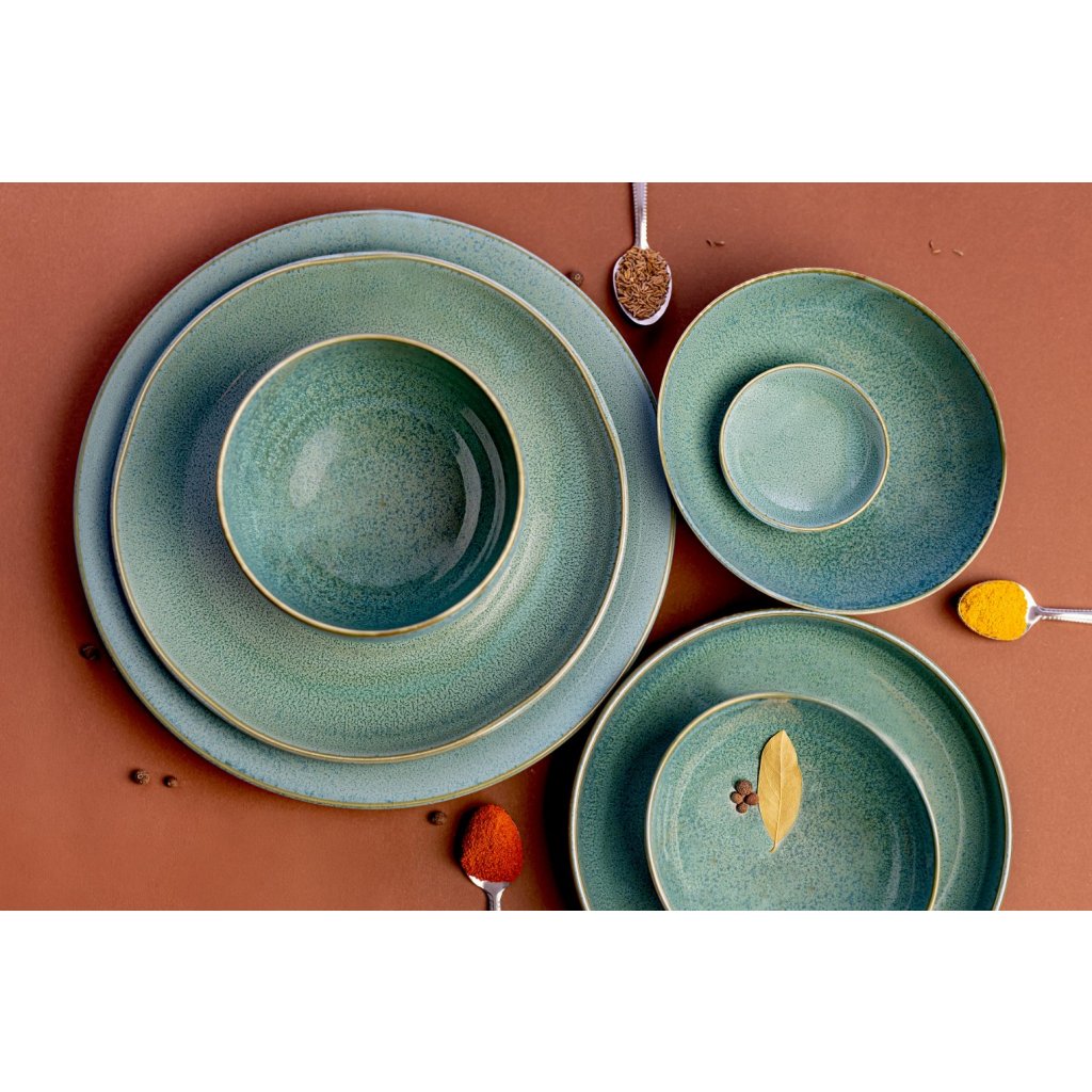 Šioje pakuotėje rasite originalią 20 cm skersmens "Peacock" kolekcijos vakarienės lėkštę aukštais kraštais. Blizganti plokštelė yra žalsvai mėlynos spalvos, o jos kraštas padengtas auksine linija.
