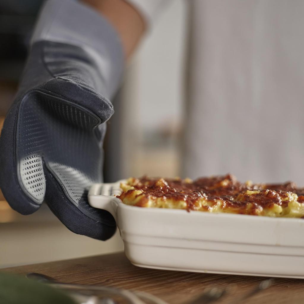 - Karščiui atsparus silikonas apsaugo jūsų rankas iki 230 °C, todėl galite saugiai išimti karštas kepimo skardas net ir esant kepsninės įrankiai temperatūrai.