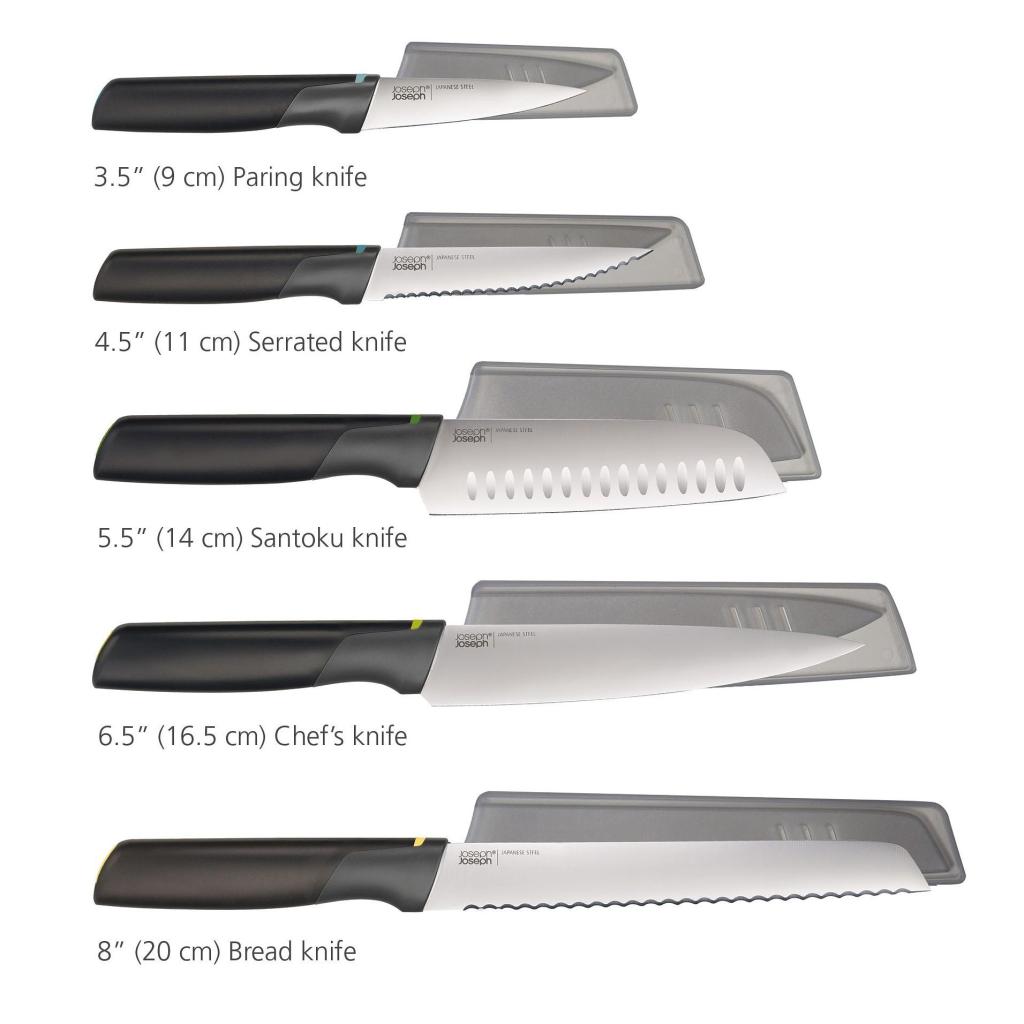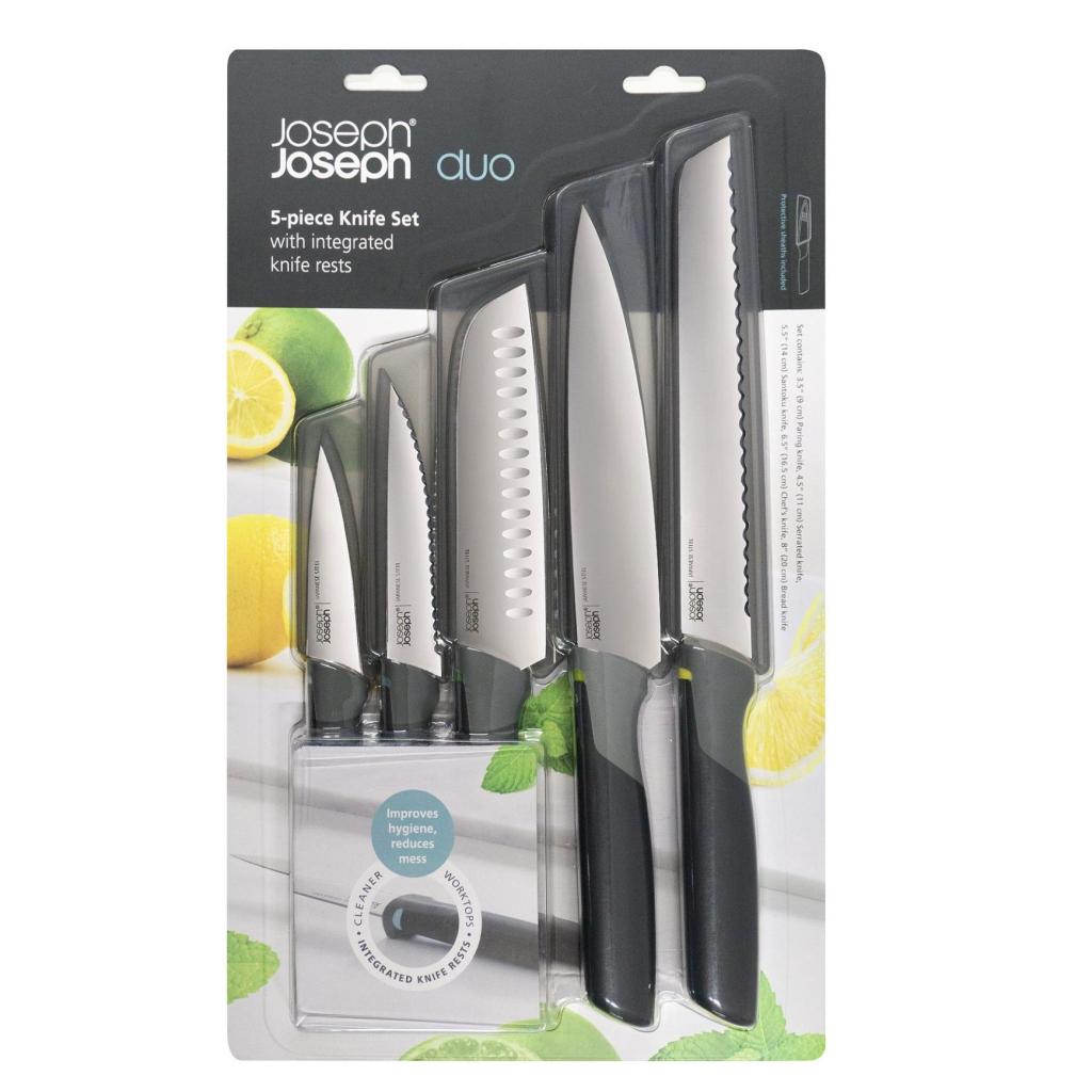 - 5 virtuvinių peilių rinkinys Joseph Joseph ELEVATE OPAL siūlo apgalvotą peilių derinį kasdieniam gaminimui, su kuriuo galėsite pjaustyti, porcijuoti ir smulkiai paruošti ingredientus, neieškodami papildomų įrankių.