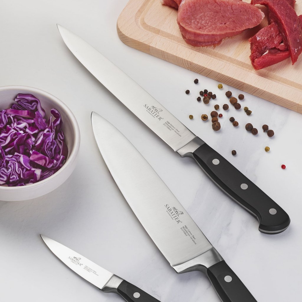 - juodos rankenos ir poliruoto plieno kontrastas suteikia peiliams patrauklią ir profesionalią išvaizdą, tinkančią bet kuriai virtuvei