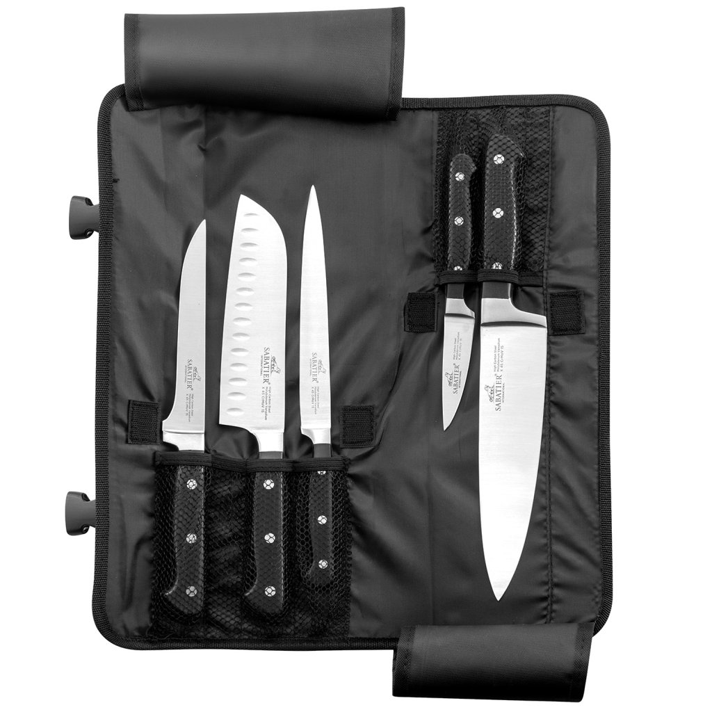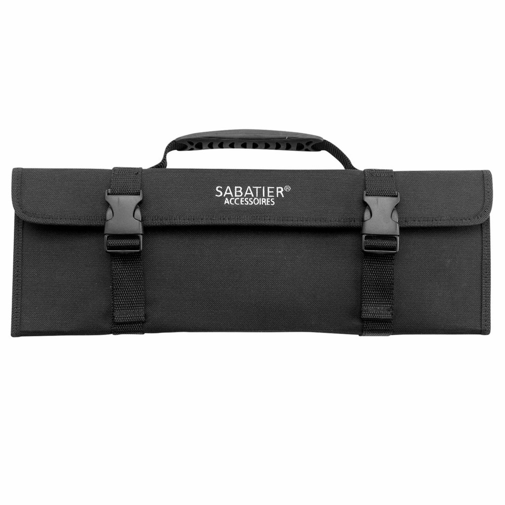 - juodas tekstilinis dėklas su kišenėmis ir rankenomis, skirtas peiliams apsaugoti laikant ir nešiojant