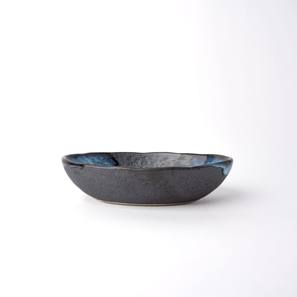 - Tamsiai mėlynos ir juodos spalvos kontrastas primena veržlų bangų judėjimą ir sukuria dramatišką foną, kuriame išryškėja bet kokio patiekalo spalvos.