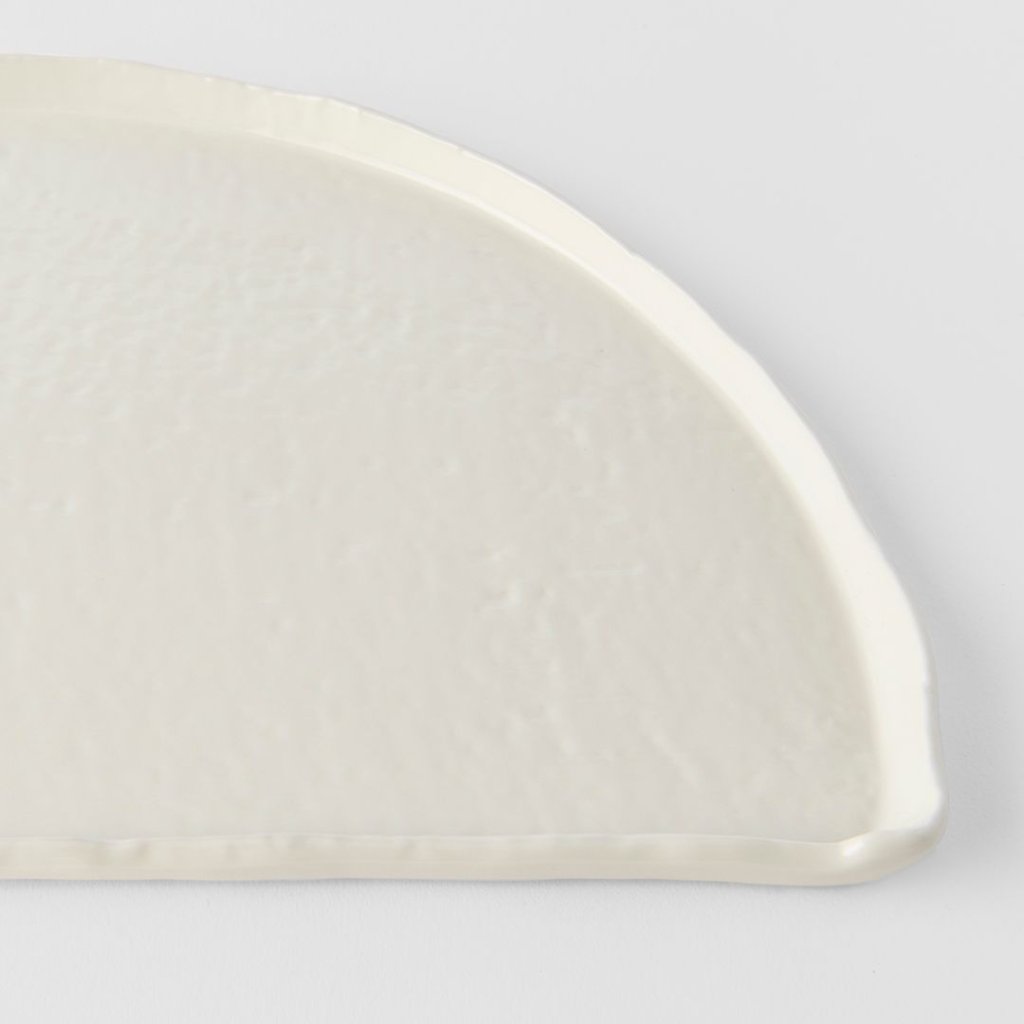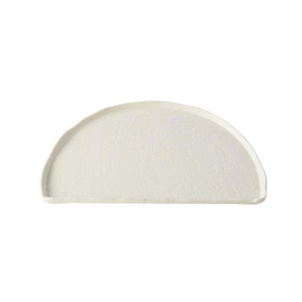 - Pusapvalė lėkštė HALF MOON, 27 cm pločio, pasižymi moderniu ir kūrybišku serviravimo būdu, pabrėžiant švarią formą ir minimalistinį dizainą.