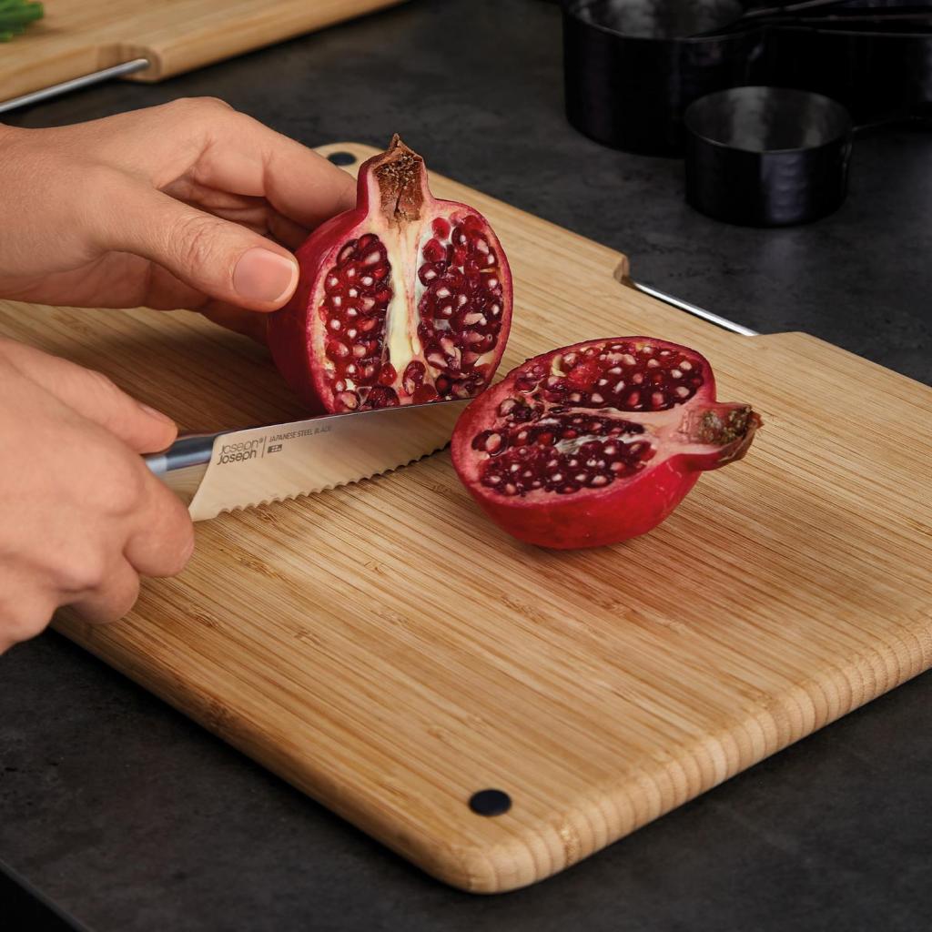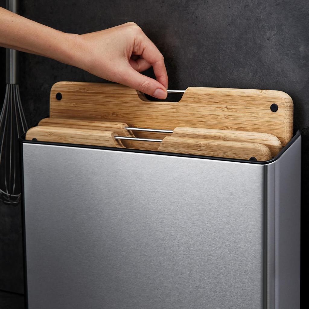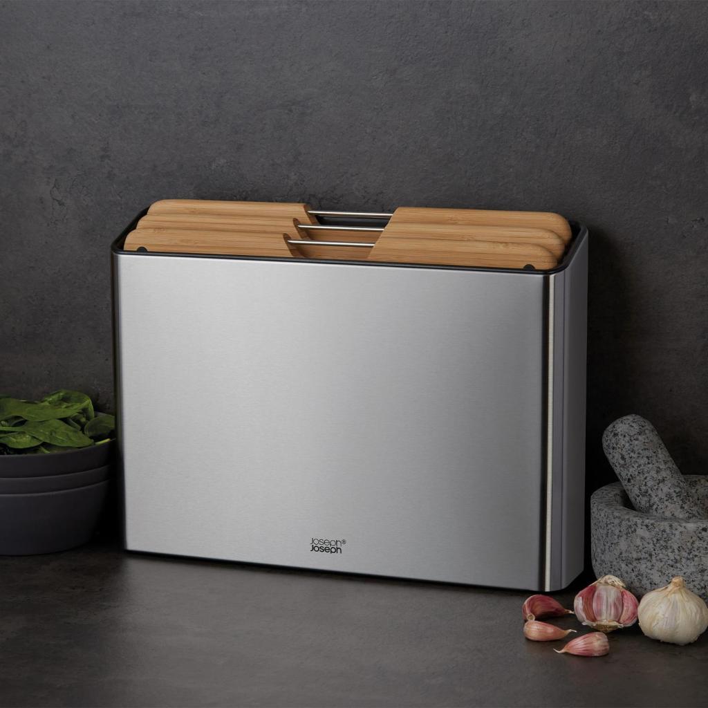 - 3 Joseph Joseph FOLIO bambukinių pjaustymo lentelių rinkinys siūlo praktišką sprendimą įvairioms žaliavoms ruošti ir, dėka elegantiško stovo, palaiko tvarkingai sutvarkytą darbo paviršių.