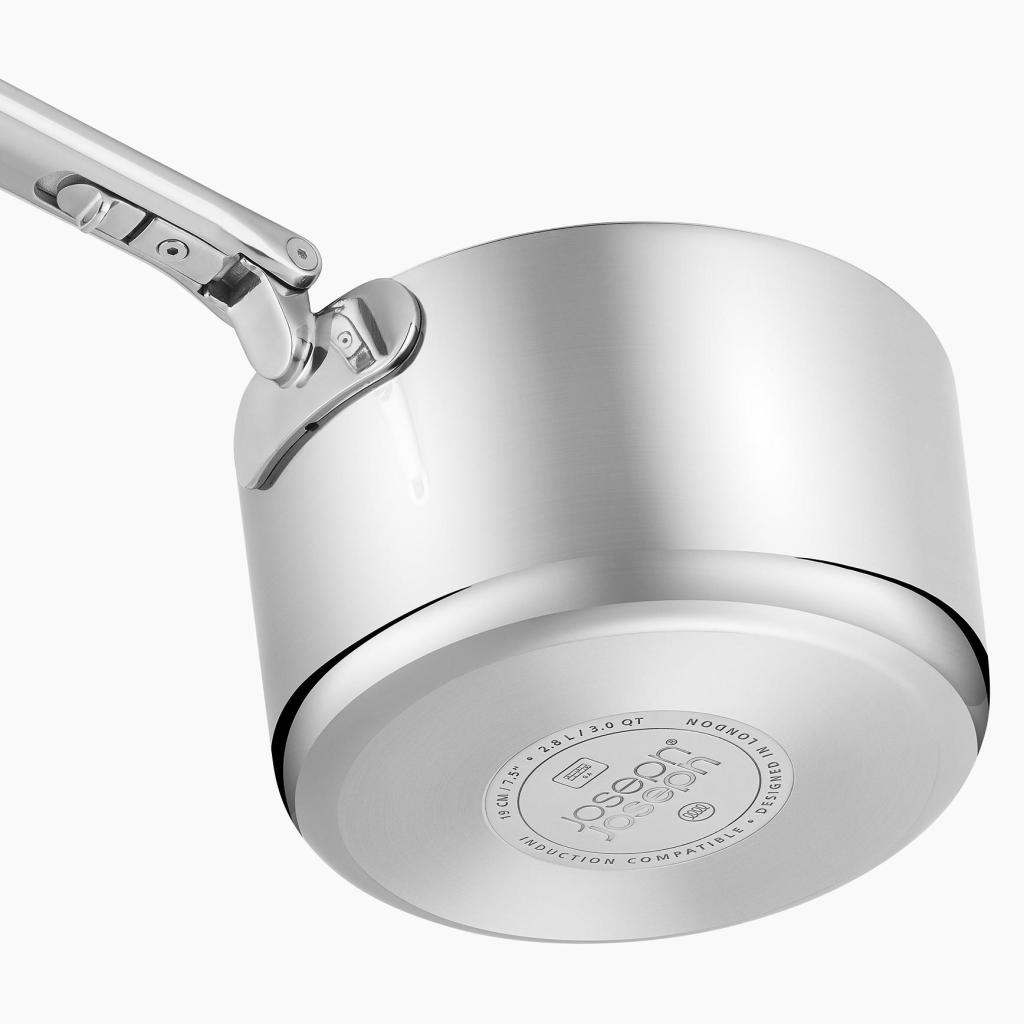 - Tvirta trijų sluoksnių konstrukcija apjungia poliruoto nerūdijančio plieno išorę, aliuminio šerdį tolygiam šilumos paskirstymui ir vidinį nerūdijančio plieno sluoksnį.
