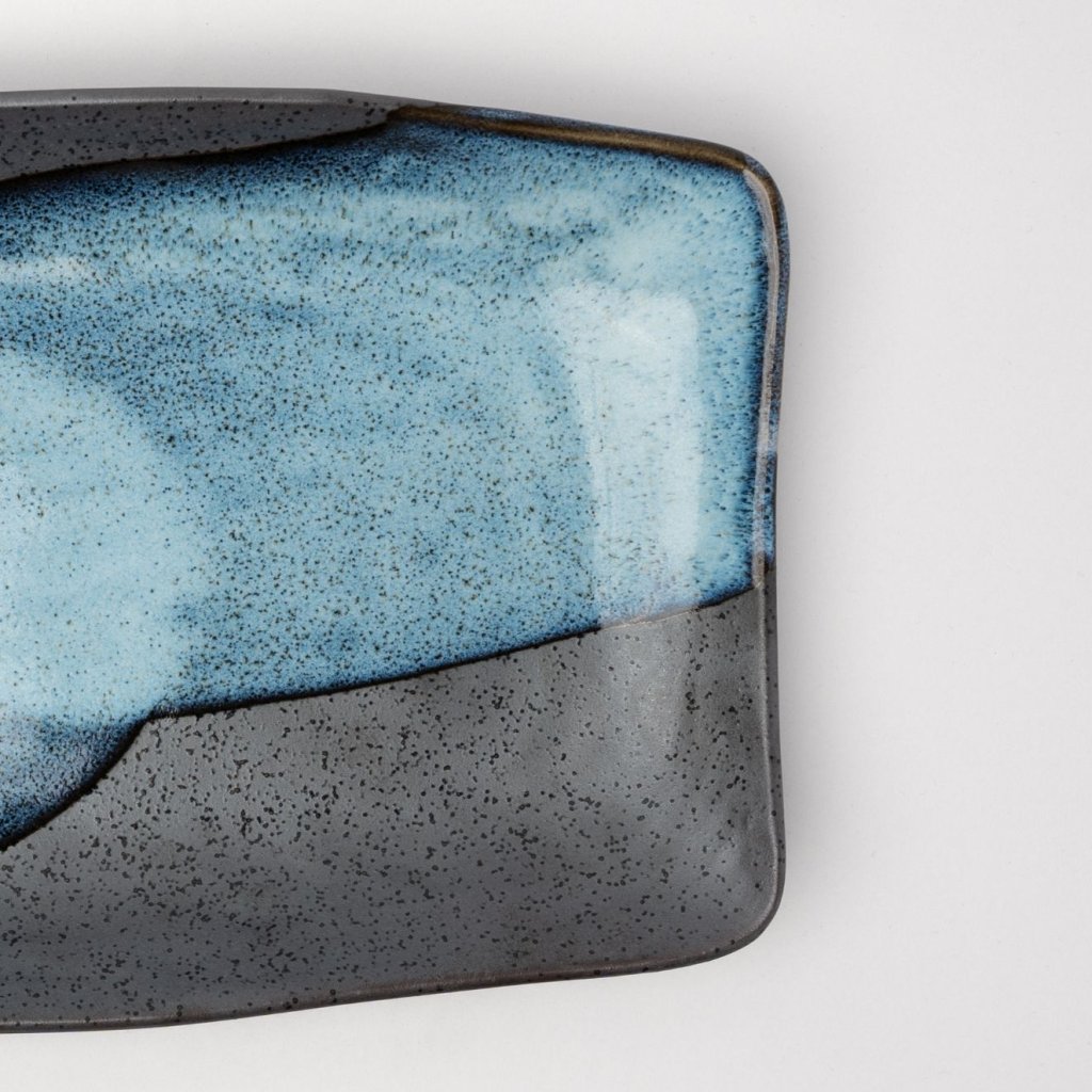 - Tamsiai juodos ir šaltai mėlynos glazūros perėjimai sukuria vizualinį gylį, kuris keičiasi priklausomai nuo šviesos ir suteikia patiekalui dramatišką vandenyno įspūdį.