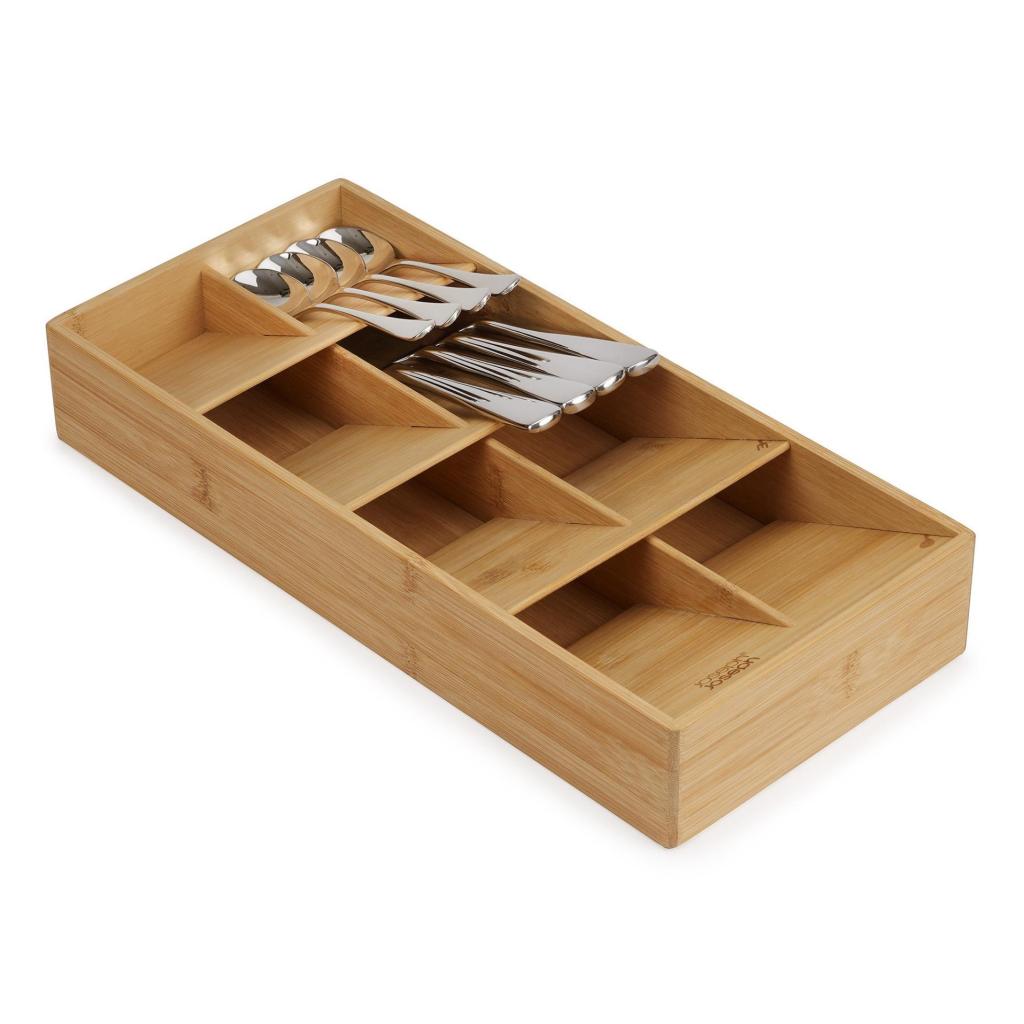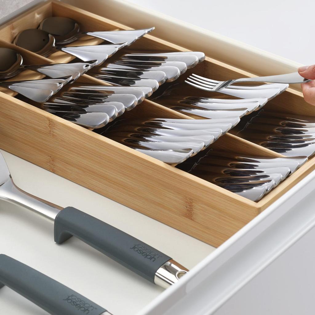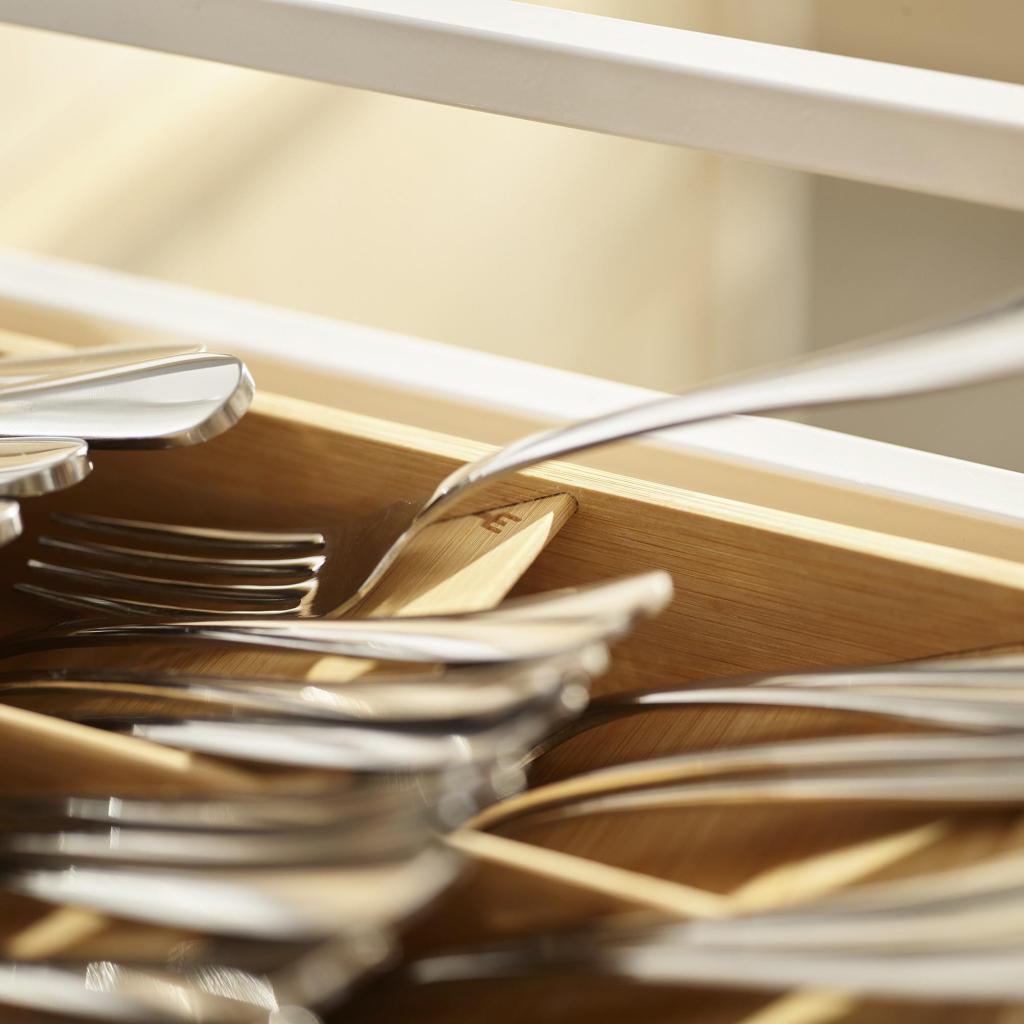 - Atskiri skyriai skirti skirtingų tipų stalo įrankiams, todėl šaukštai, šakutės ir peiliai turi savo vietą.