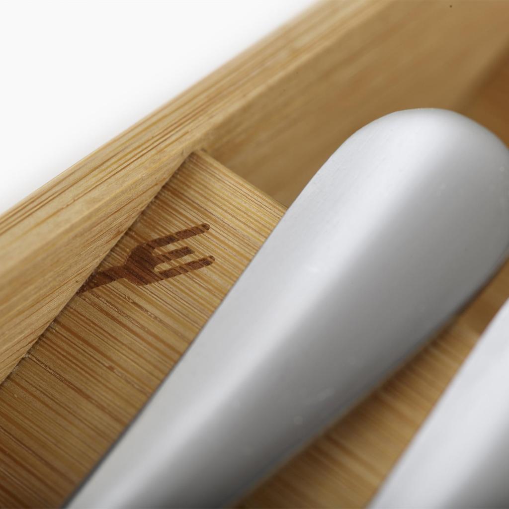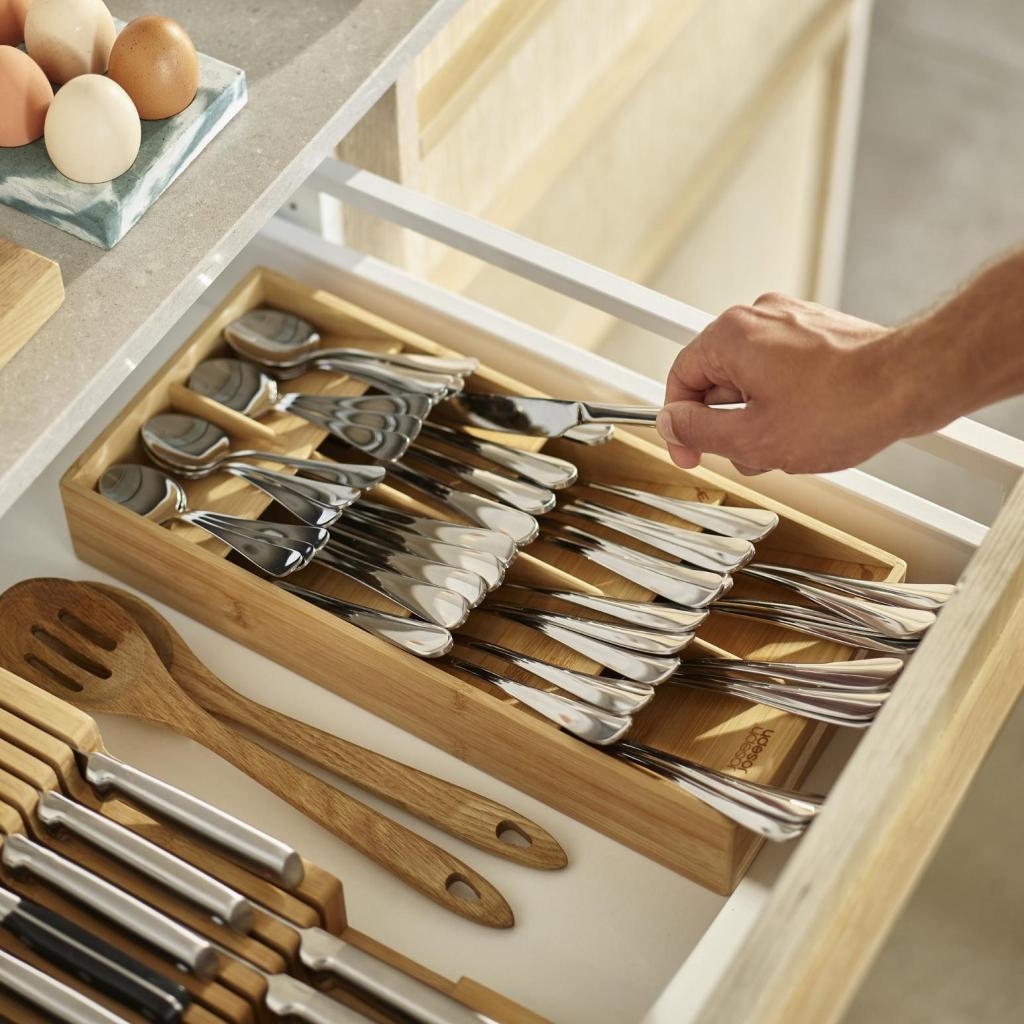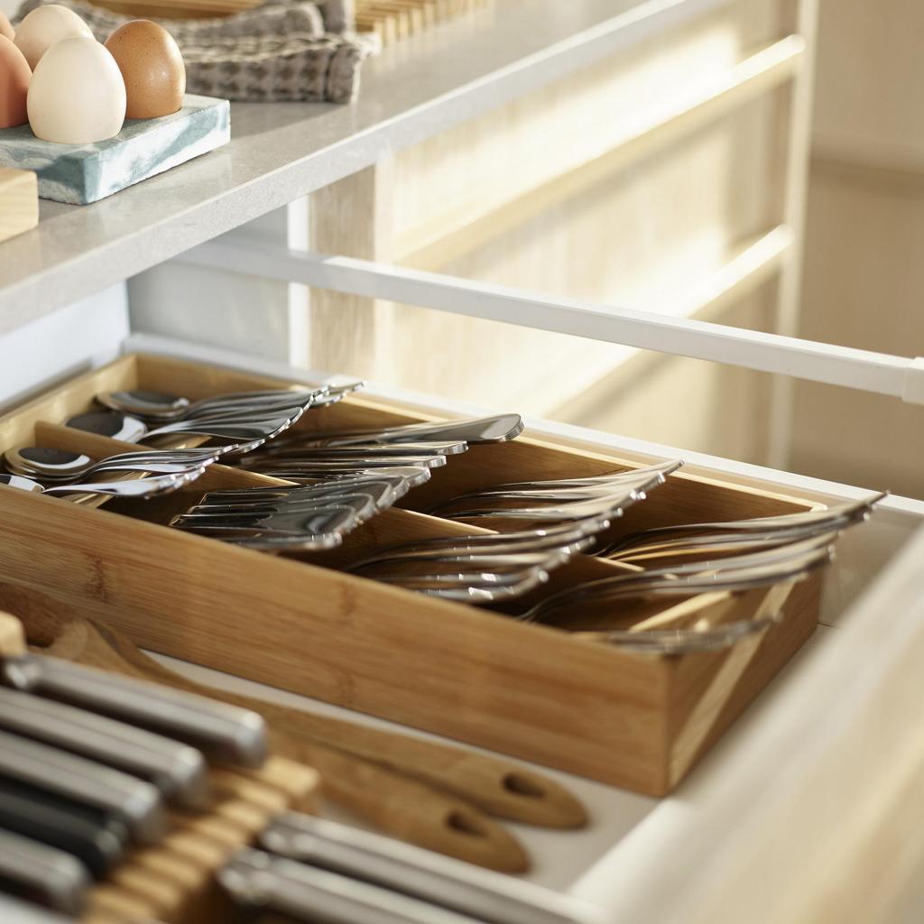 - Atskiri skyriai skirti skirtingų tipų stalo įrankiams, todėl šaukštai, šakutės ir peiliai turi savo vietą.