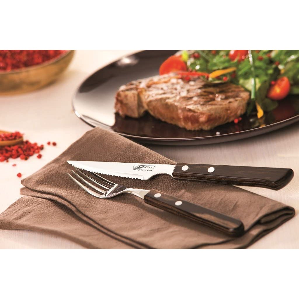 Kuo daugiau draugų pakviesite į gimtadienio ar kitą kepsnių vakarėlį, tuo gražesnis bus renginys. Kol sultinga mėsa kepa ant grotelių ir skleidžia nenugalimą aromatą, lieka daug laiko maloniems pokalbiams su gerais draugais. Kad mėsos gabalėlius valgytumėte stilingai, TRAMONTINA siūlo aukštos kokybės 12 dalių kepsnių ir picų rinkinį. Peiliai ir šakutės pagaminti iš AISI 420 nerūdijančiojo plieno (DIN 1.4028) ir yra puikiai subalansuoti. Rankenos pagamintos iš POLYWOOD - keli pušies medienos sluoksniai impregnuojami derva, suspaudžiami, supjaustomi ir poliruojami, kad būtų sukurtas itin patvarus ir karščiui atsparus kotas. Tai įrodo ir tai, kad stalo įrankius, kurie taip pat puikiai tinka picai, galima plauti indaplovėje.