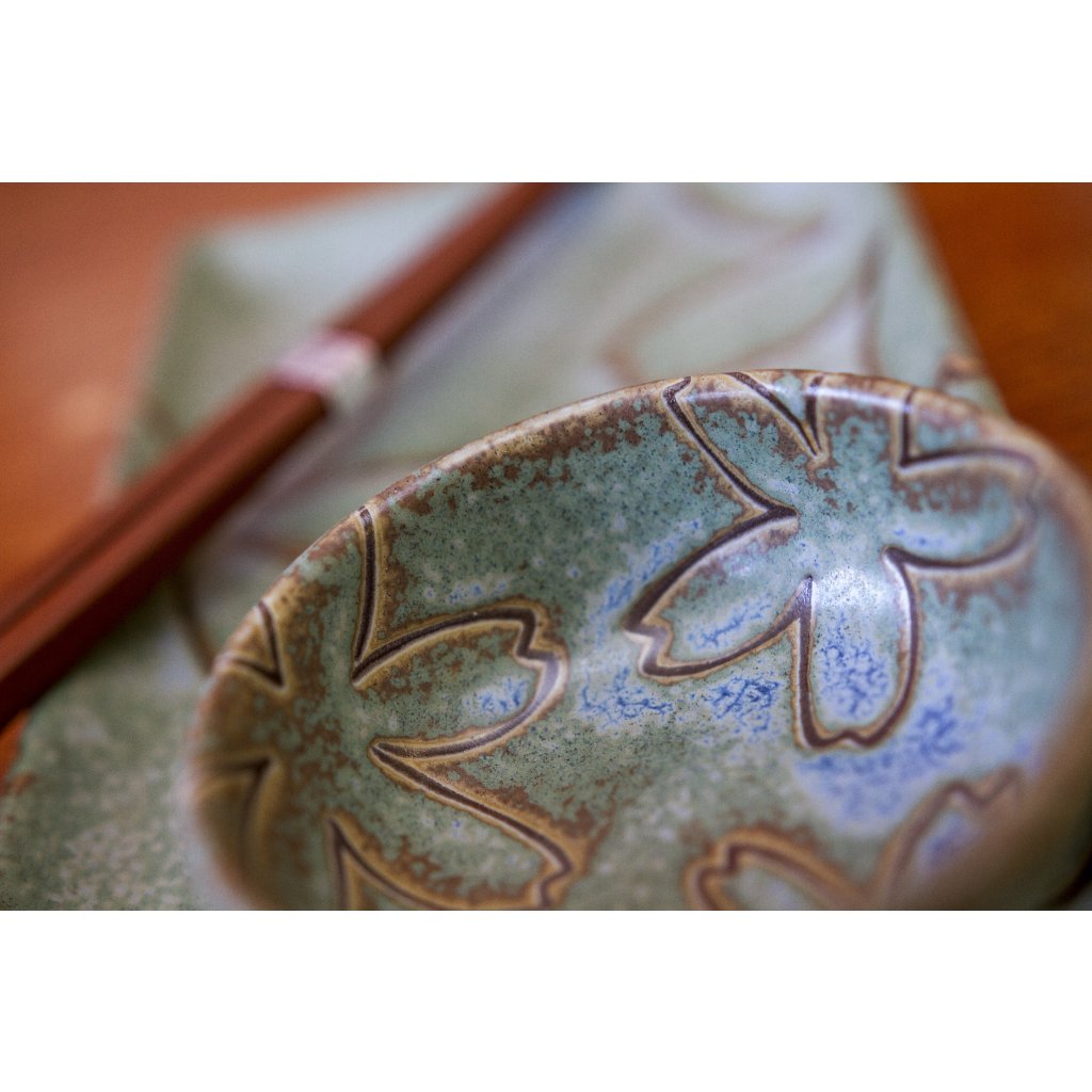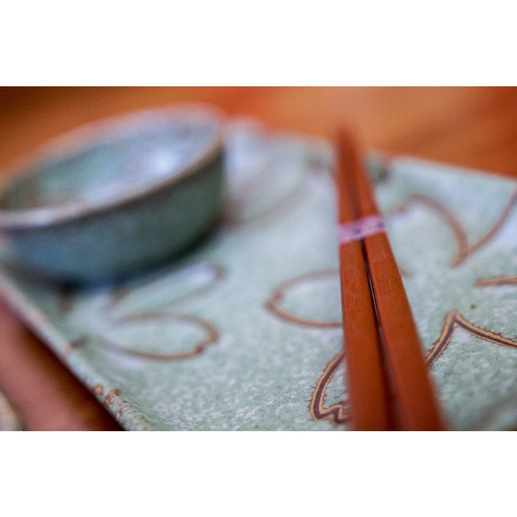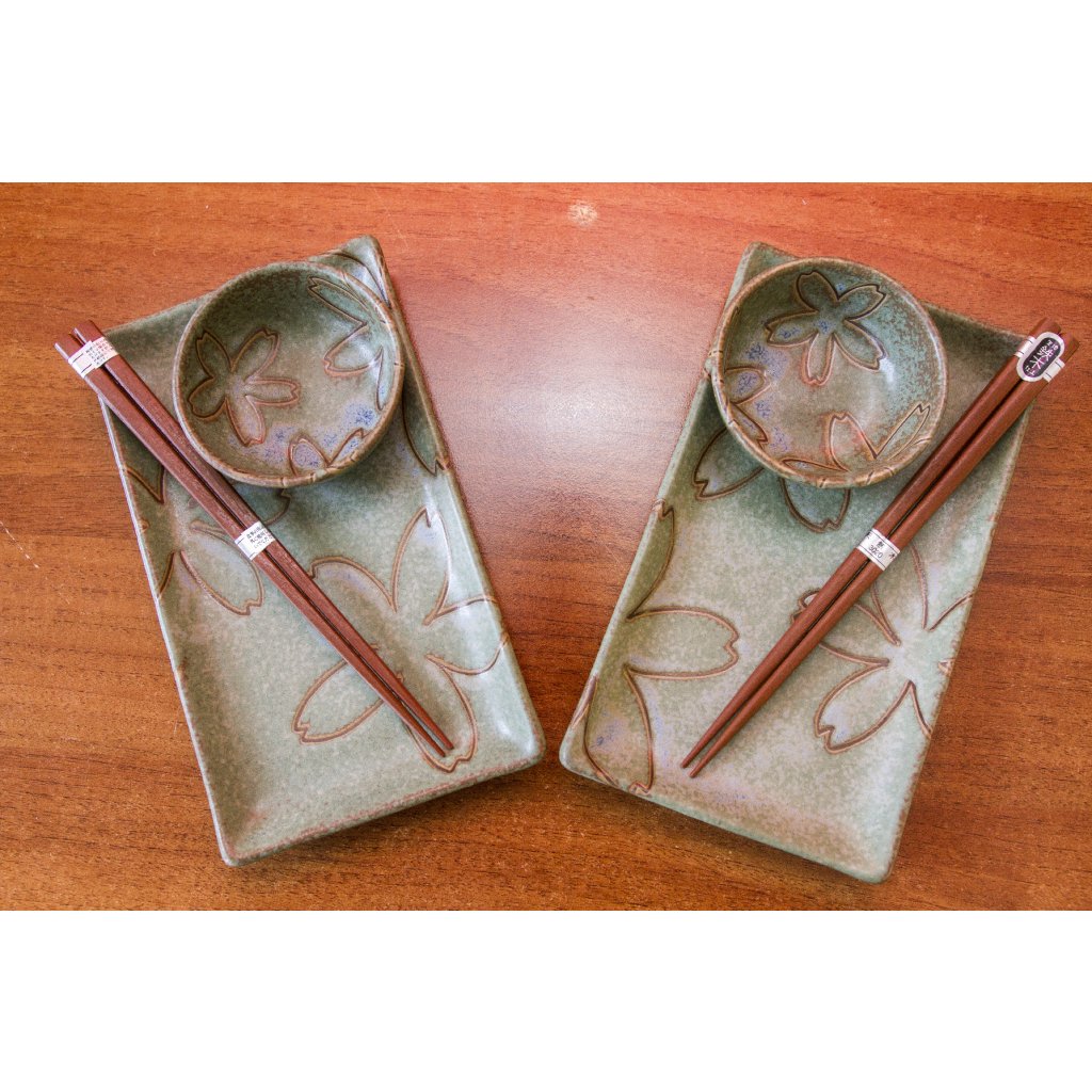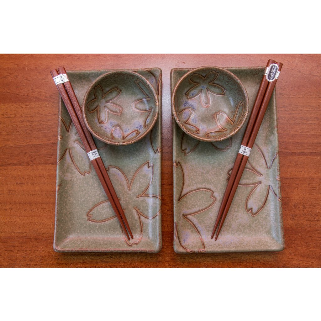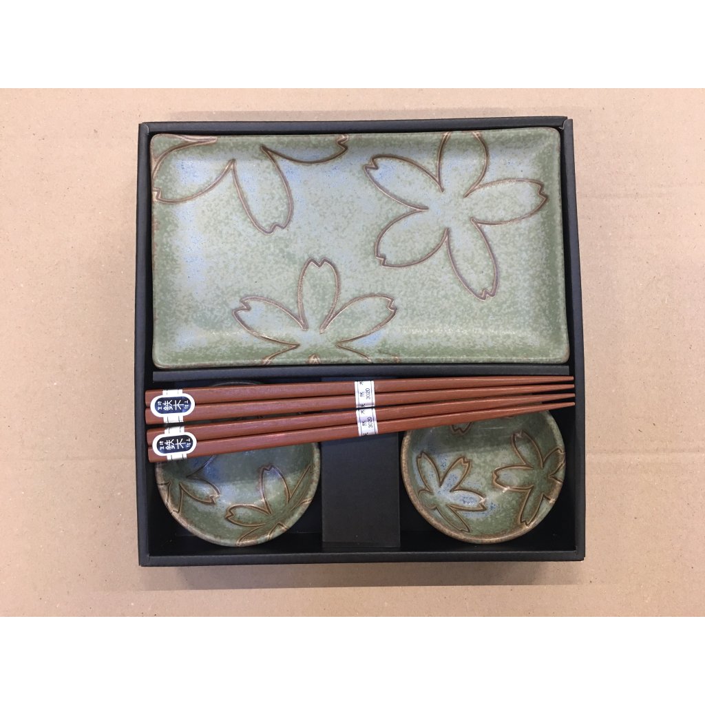 Lėkštės ir dubenys yra žalios spalvos su gėlių motyvais. Rinkinį naudokite suši su padažais patiekti, tačiau dubenėlius galite naudoti ir sakėms. Šis rinkinys pateikiamas juodoje dovanų dėžutėje, todėl tinka dovanoti.