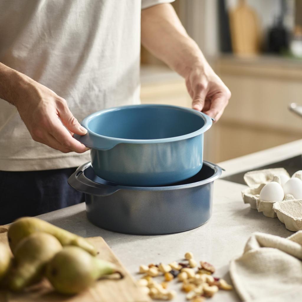 - NEST BAKE mėlynos spalvos apvalios torto formų rinkinys suteikia praktišką sprendimą kepant kelis torto sluoksnius ir įvairius desertus, užtikrinant tobulą rezultatą.