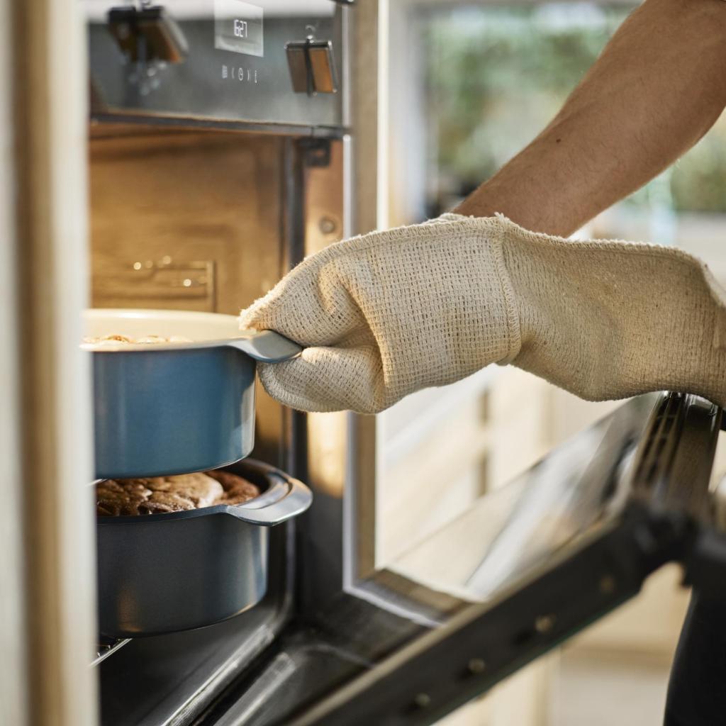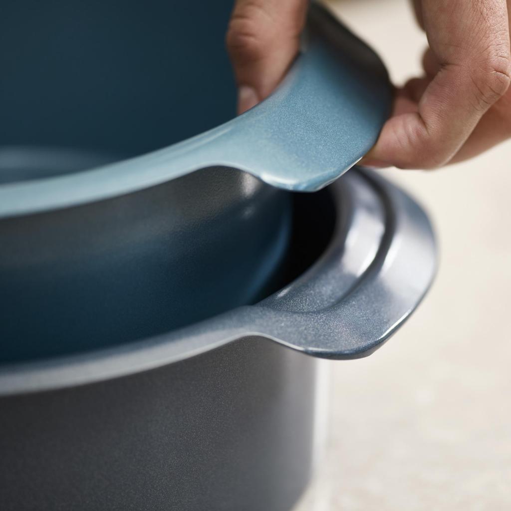 - Praktiškos praplėstos šoninės rankenos sukuria didesnį sukibimo plotą, leidžiantį patogiai valdyti net naudojant storus virtuvės pirštines.