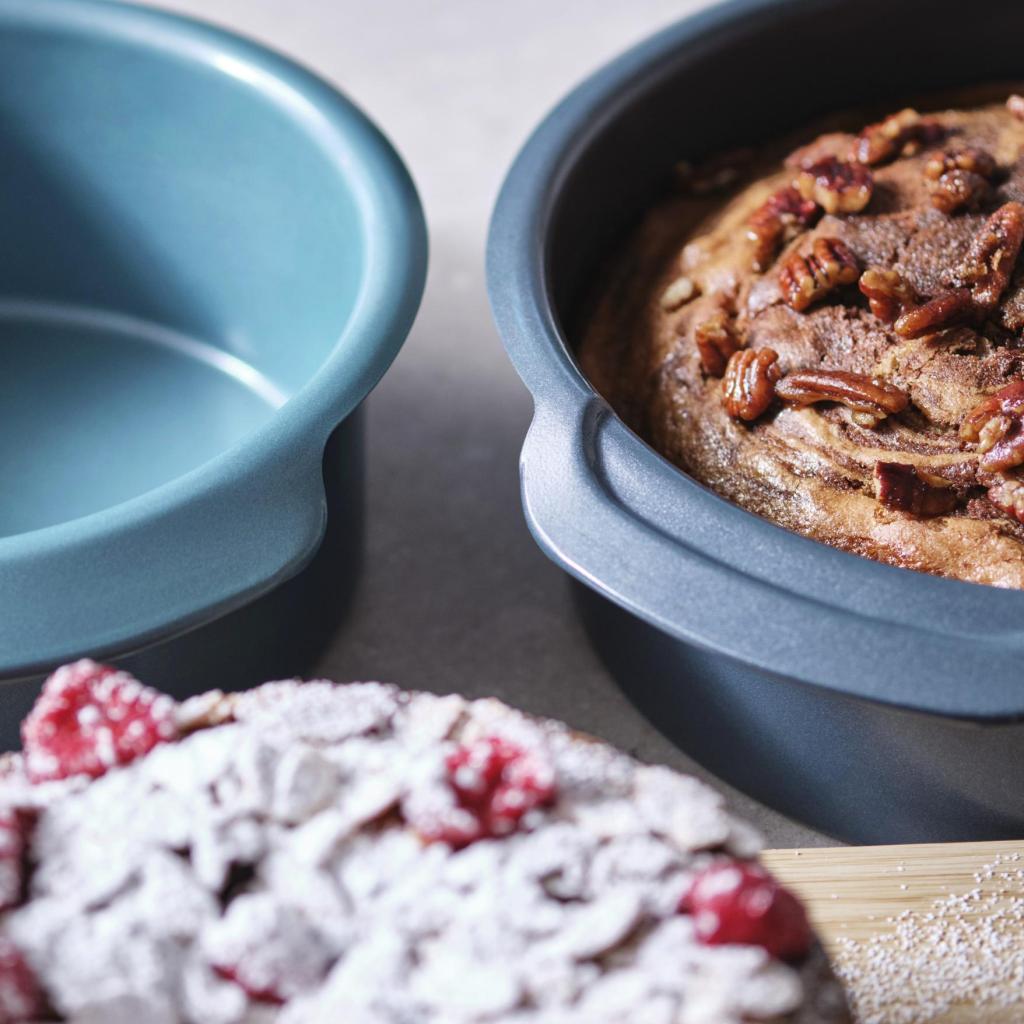 - Tortinė NEST BAKE, kurios vidinis skersmuo 23 cm ir mėlyna spalva, idealiai tinka purių pyragų, biskvitų ir minkštų naminių kepinių paruošimui.