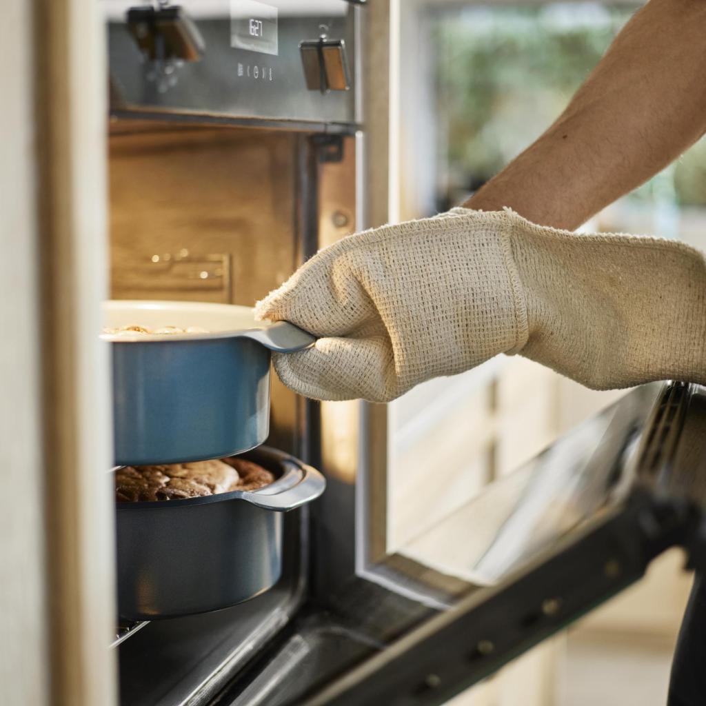 - Išplėstos šoninės rankenos suteikia didesnį sukibimo paviršių, kuris palengvina formos valdymą naudojant virtuvines pirštines.