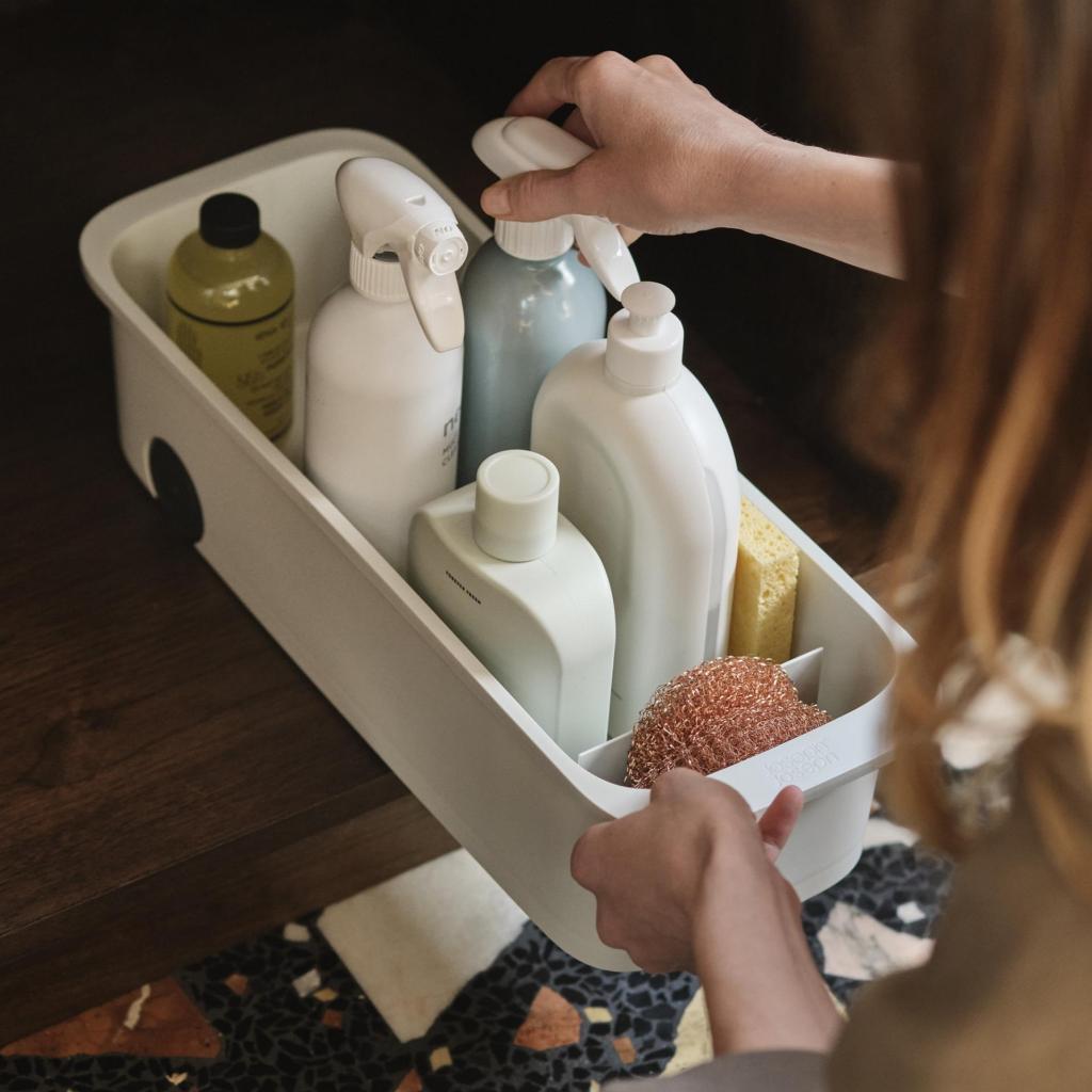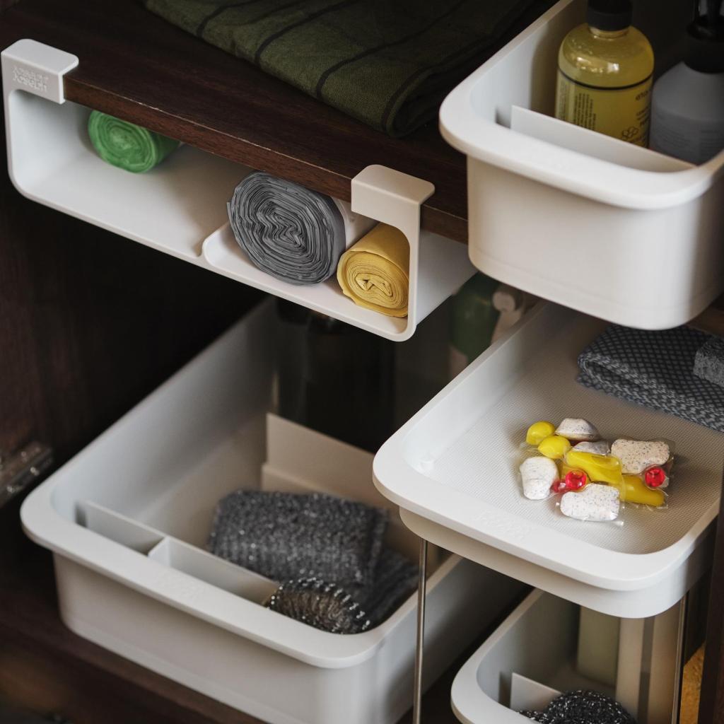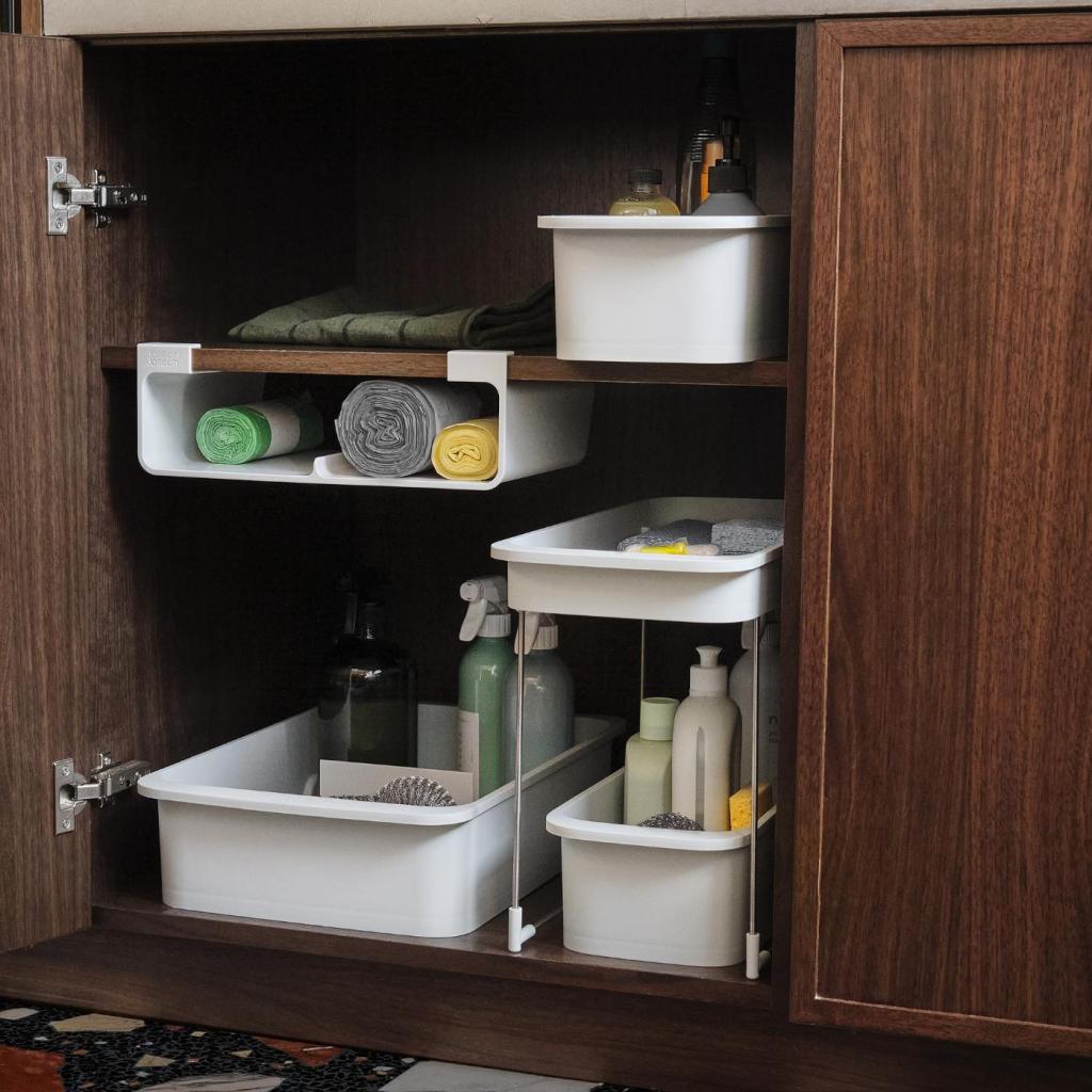 - „Joseph Joseph CUPBOARDSTORE“ organizatorius yra praktiškas pagalbininkas tvarkingai sudėti valymo priemones po kriaukle ir palengvina kasdienį namų tvarkymą.