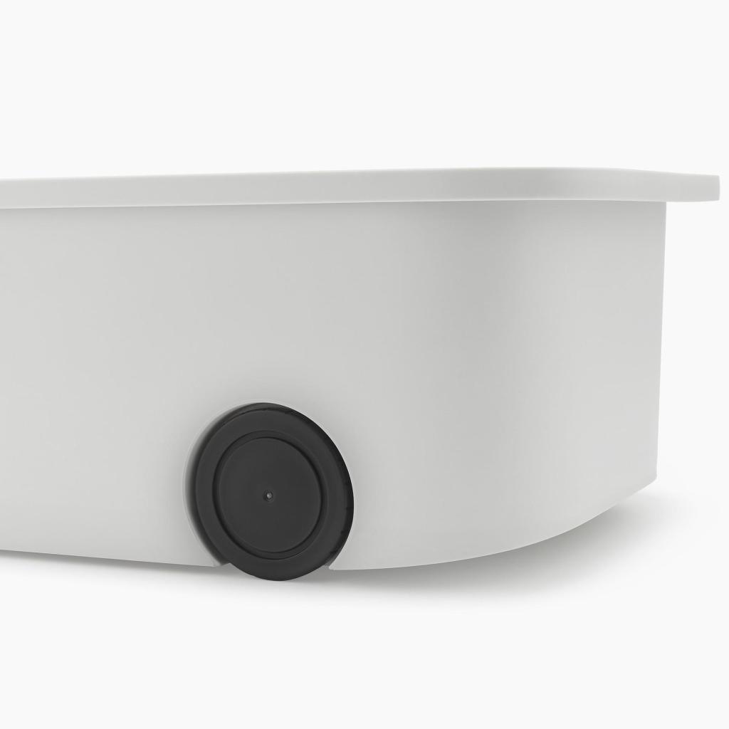 - Apatinėje dalyje esantys ratukai leidžia sklandžiai judėti organizatoriui ant lentynos, todėl jį lengva ištraukti net iš gilesnių spintelių.