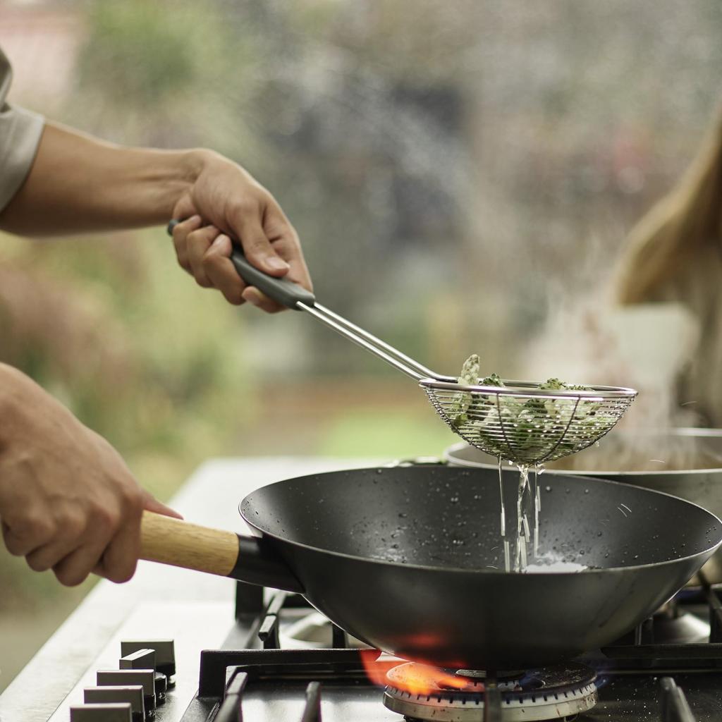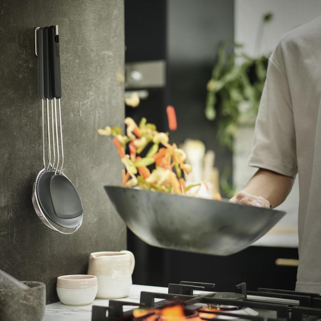 Ne kiekvienoje virtuvėje yra vietos visam virtuvės įrankių arsenalui, kurį įvertintų profesionalus virėjas. Vis dėlto, kartais norisi maišyti, apversti ir iš keptuvės išgriebti ingredientus tarsi gero azijietiško restorano virtuvėje. Trys įrankiai viename rinkinyje atlieka visus svarbiausius darbus, o po gaminimo juos galima sulankstyti taip taupiai, kad jie neužims daugiau vietos nei vienas įprastas virtuvės pagalbininkas.