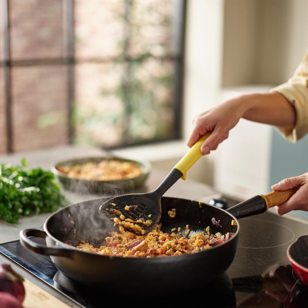 - Idealiai tinka maišyti rizotą, apversti blynus, kepti kiaušinius ir ruošti keptas daržoves kasdienio maisto gaminimo metu.