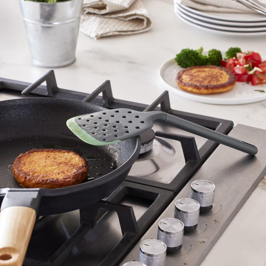 - Įrankį galima saugiai padėti ant įkaitusios keptuvės krašto, nes jis sukurtas taip, kad atlaikytų aukštą darbinę temperatūrą.