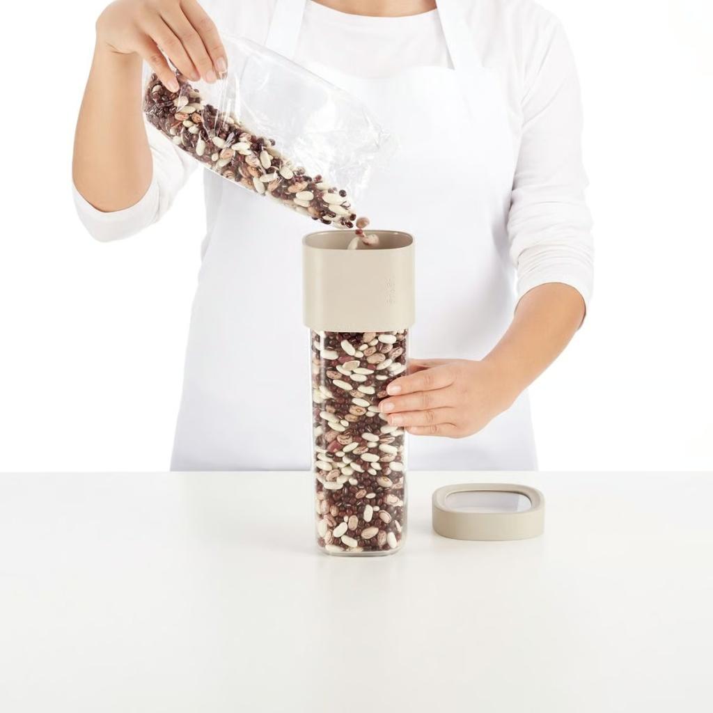 - Virtuvinis laikymo stiklainis Lékué FLIP STORAGE skirtas sausų maisto produktų, tokių kaip makaronai ar dribsniai, laikymui.